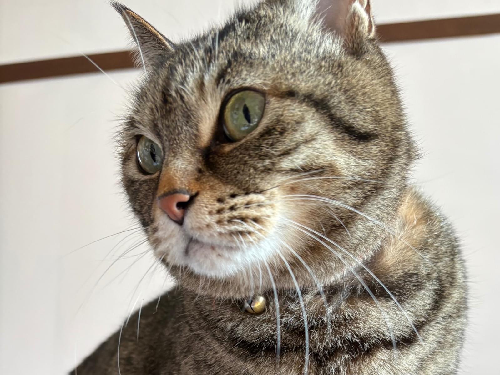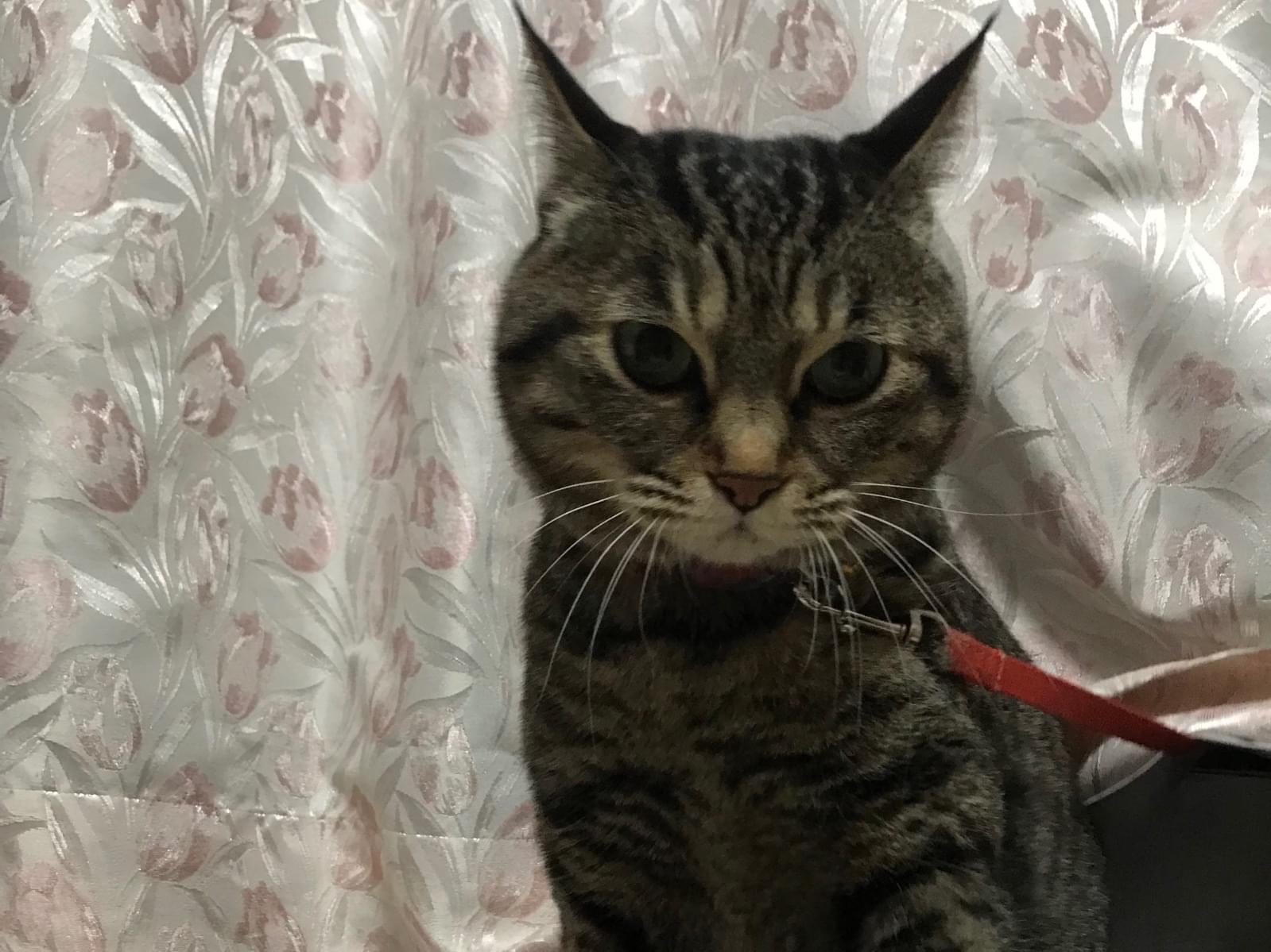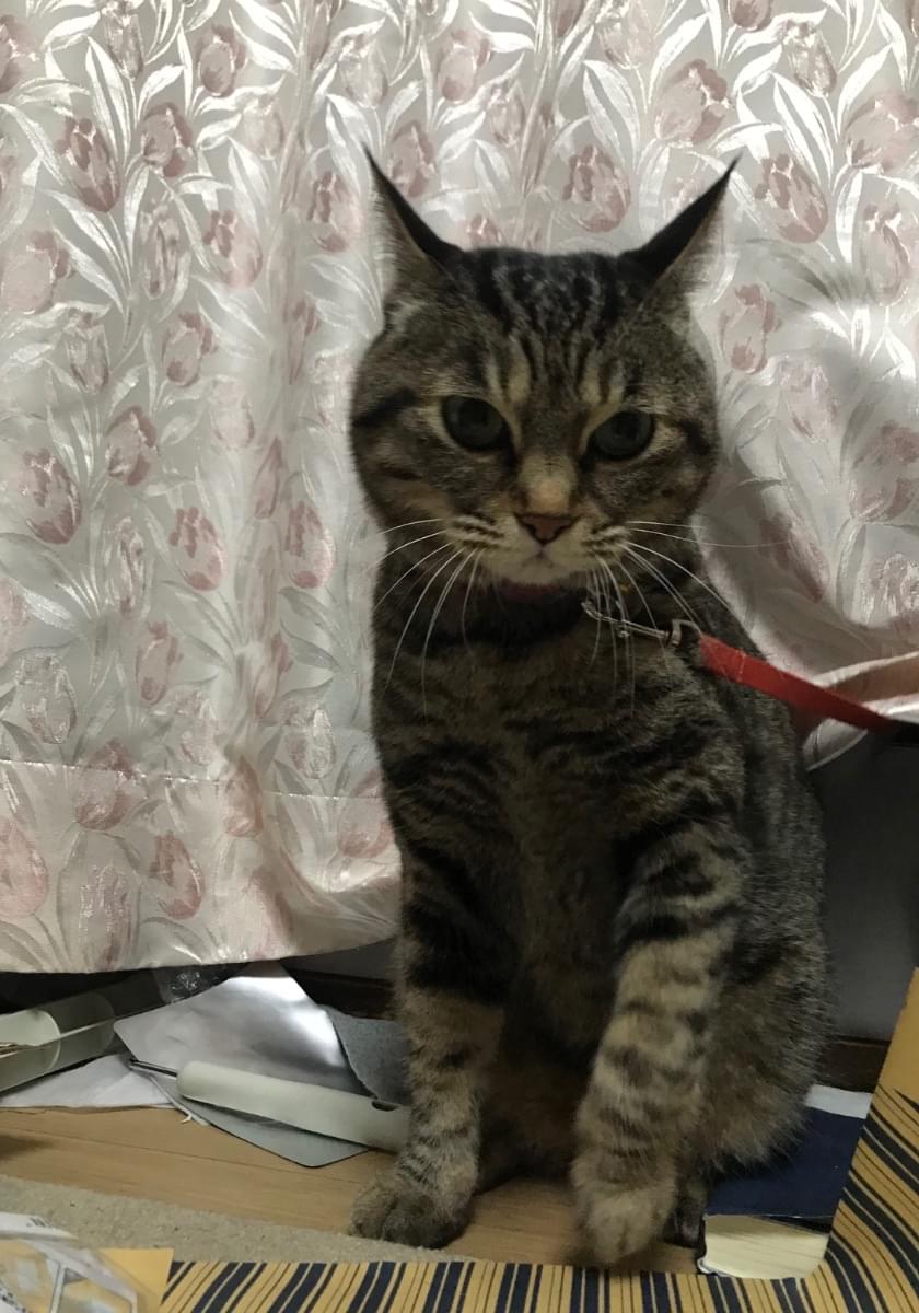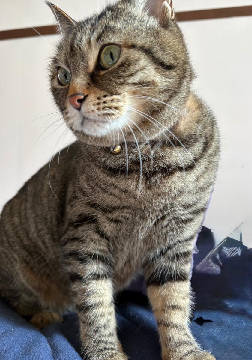 キジトラのしっぽが短いこです。声が甲高いので、一見若い猫に見えます。