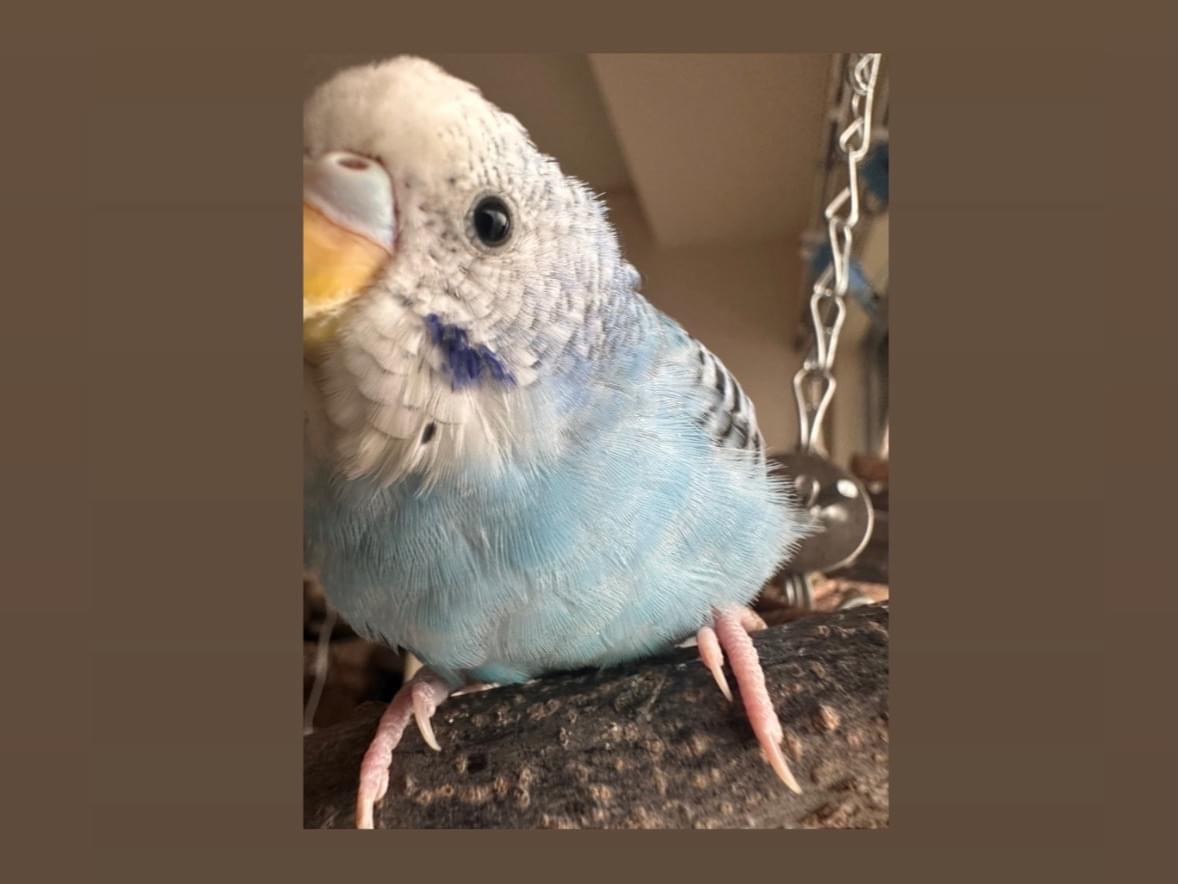 少し薄めの水色のセキセイインコで、背中は黒、鼻はピンクのまだ若い女の子です。