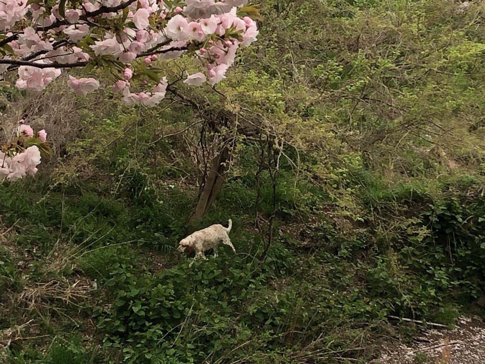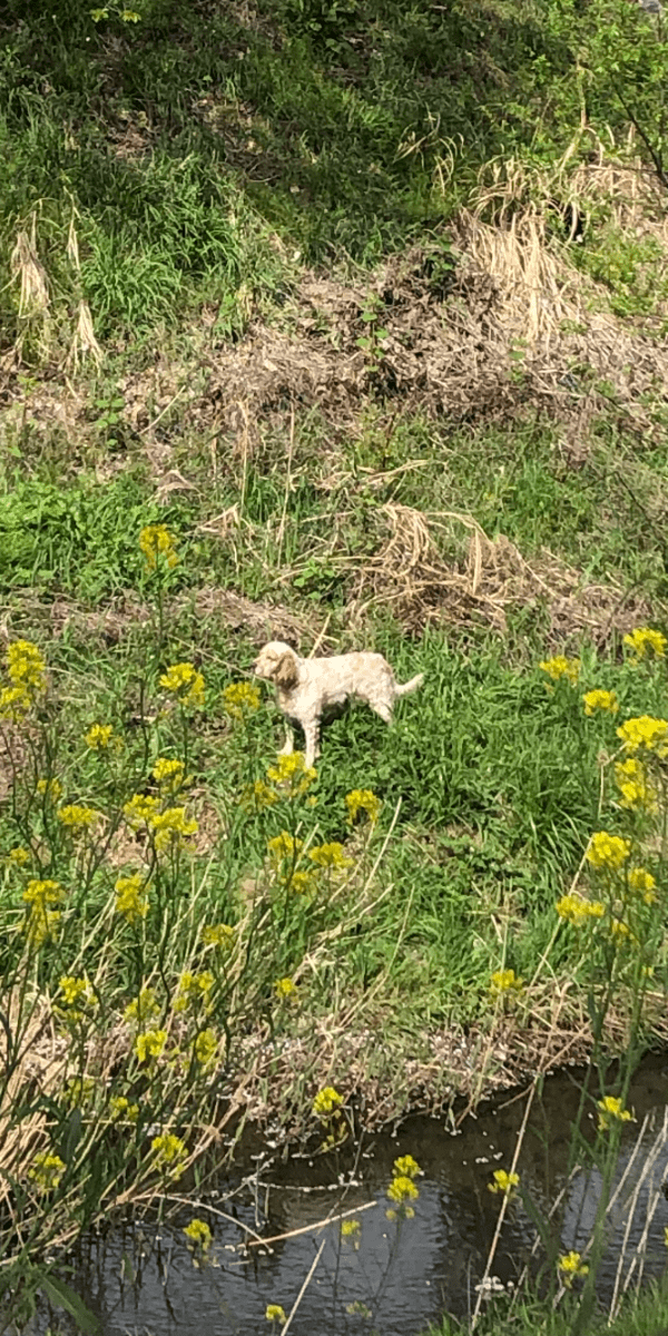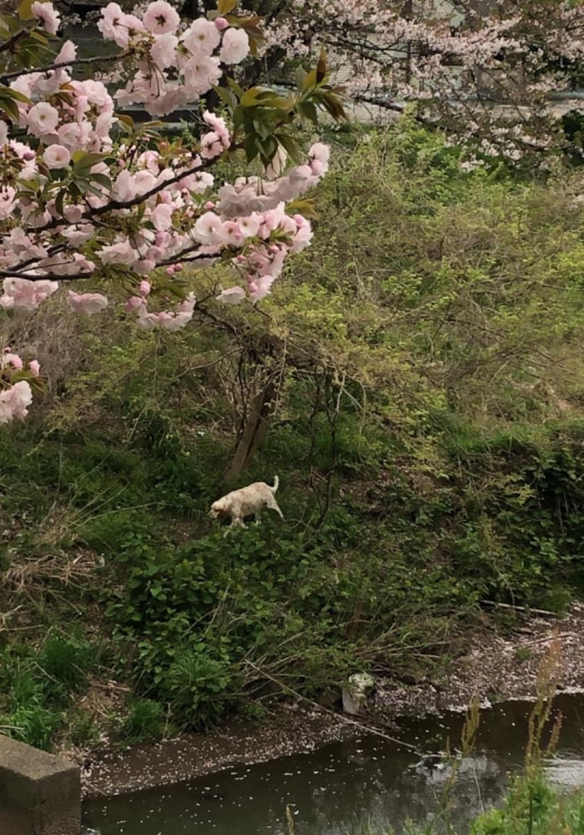 2026年4月9日に公園近く(4丁目)の河川敷にて、辺りを見渡している犬を発見しました。翌日、4月10日にも居て草を食べている様子でした。坂がきつく登ってこれないです。首輪はしていません。耳は茶色で、全体はベージュ、背中には薄い別の色で縞模様みたいになっています。