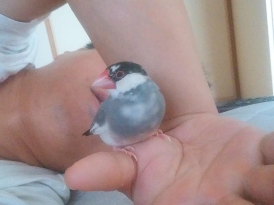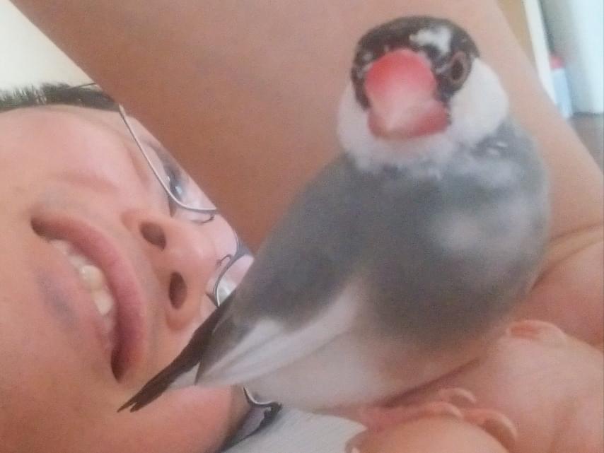 行動:人が好きで、手や肩に乗ります。気に入った人物の体の上には長時間居座ることがあり、その人がケイタイをいじっていると手首に止まっていたり、ノートパソコンを触っていればキーボードの上に止まってじっとしているときがあります。とても慣れた人物なら、手の中で何時間でも寝ます。三角形の空間が好きなようで、気に入ったところがあると長い時間のぞき込んで、そろりそろりと入っていき、無言で滞在しています。自己主張が強く、嫌いな人や気の乗らないシチュエーションでは「プルルル」と威嚇して激しくつつきます。