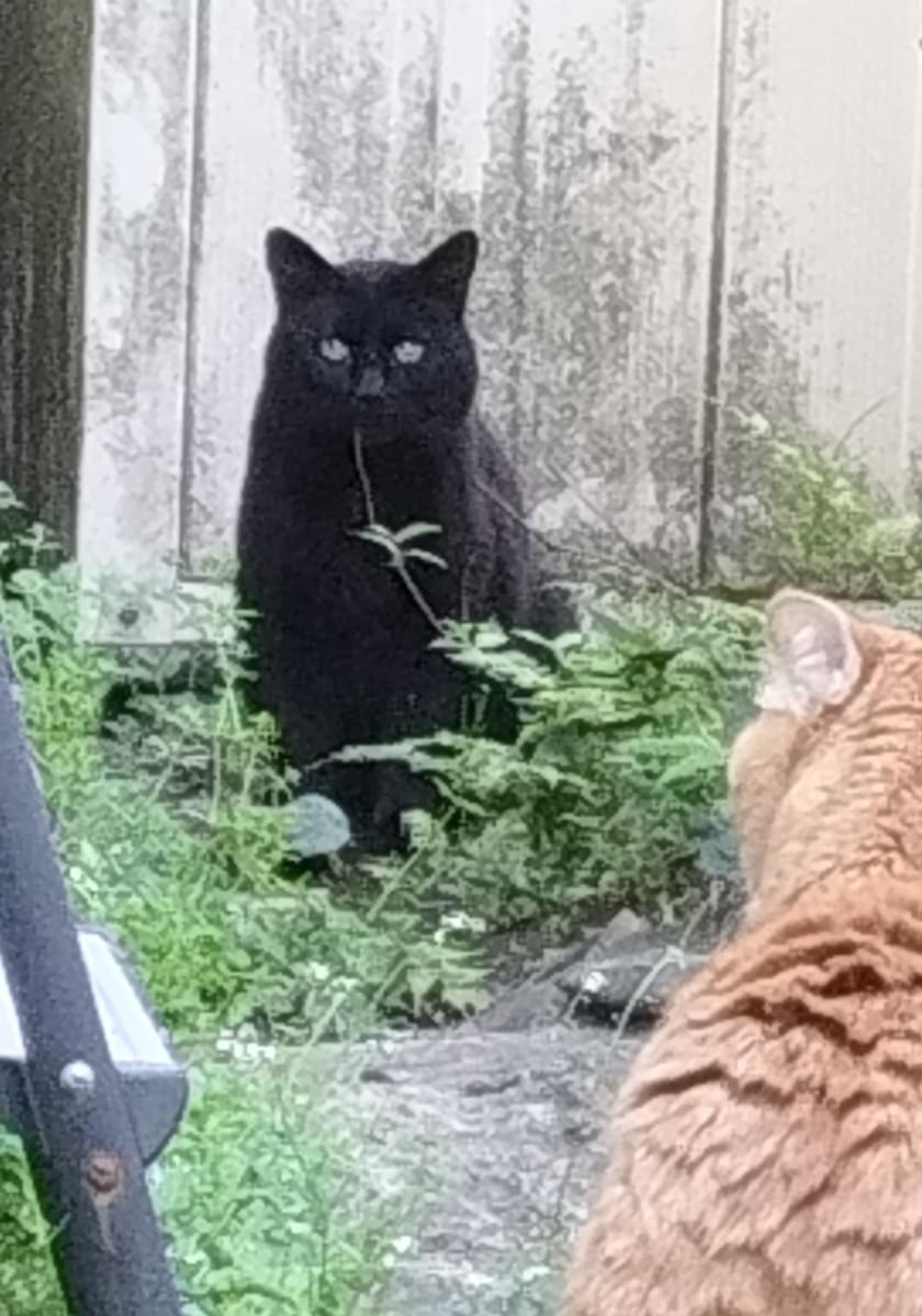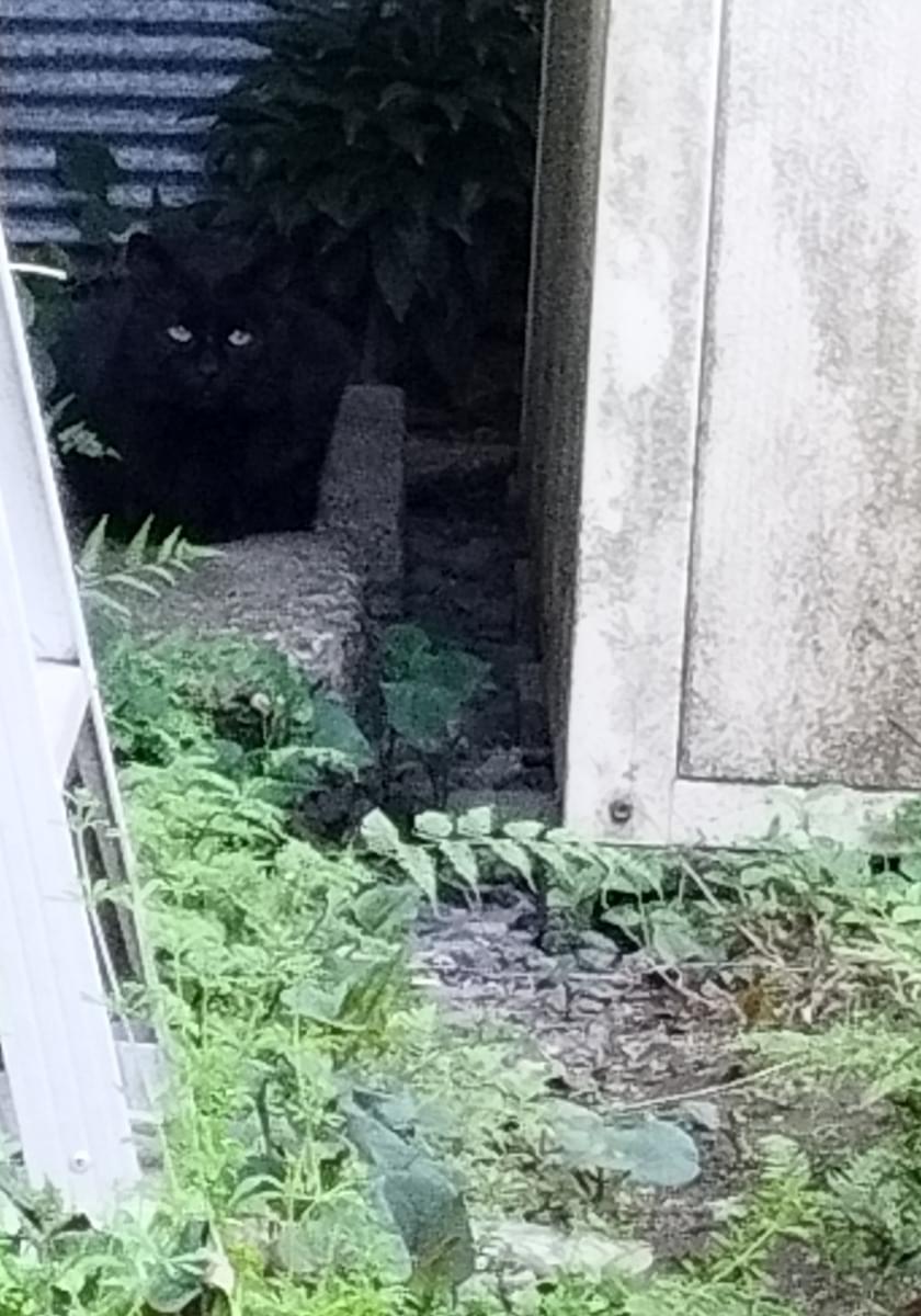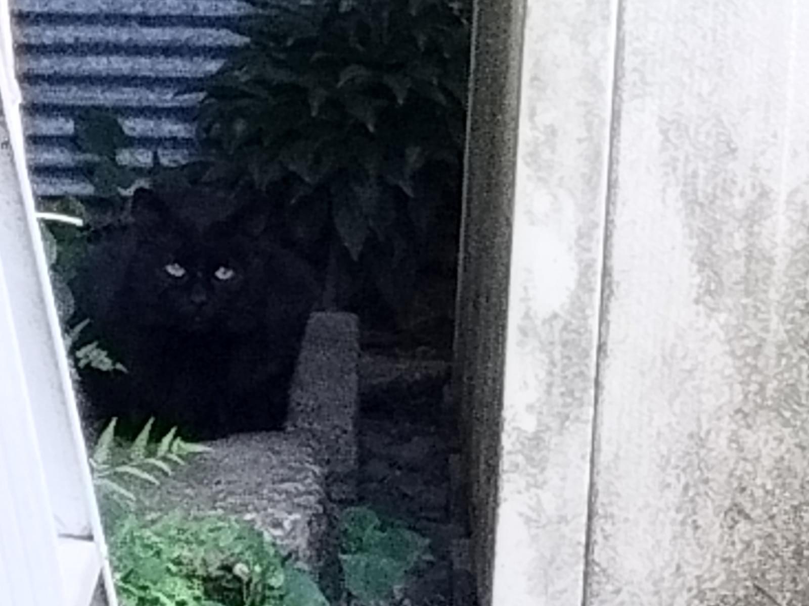4月はじめあたりから、家の周りに黒猫さんがいます。身体は普通くらいで、目は緑色で、声は高めで、しっぽは長くてちょっとへの字に曲がっています。♂か♀かは不明です。ご飯は与えているものを、多分食べています。近づくと逃げてしまいますが、ある程度の距離があればじっとコチラを見ています。