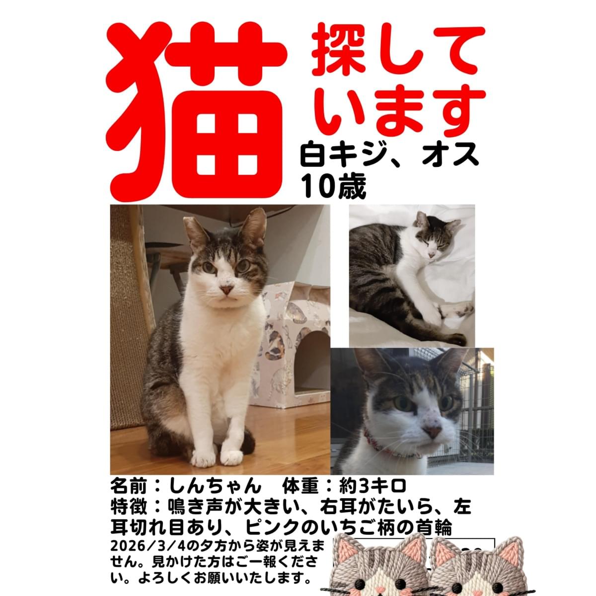 ホーム迷子猫千葉県しろきじ 耳カットあ…しろきじ 耳カットあり管理編集するポスター掲載終了最終更新日時:2026/04/12 19:46写真動画情報用件迷子名前しんしん性別オス年齢10場所千葉県 市川市新田発生日時2026年3月4日(水)飼い主大久保説明特徴:鳴き声が大きい 右耳が平ら 左耳に切れ目あり ピンクのイチゴ柄の首輪連絡先URL未設定掲示板情報交換のための掲示板です。ユーザーからの情報提供、オーナーからの連絡などにご利用下さいませ。書き込んだ情報は、オーナーのメールに通知されます。まだコメントはありません。トピックを作成する
