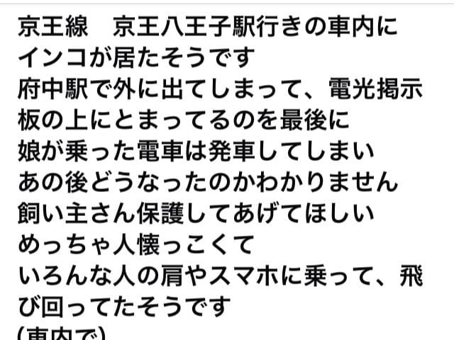 Facebookで見ました。八王子市行き京王線車内にいたそうです。府中駅で外のホームに飛び出してしまったそうで誰も保護しなかったみたいです。飼い主さんに戻してあげてほしい。誰か保護できませんか