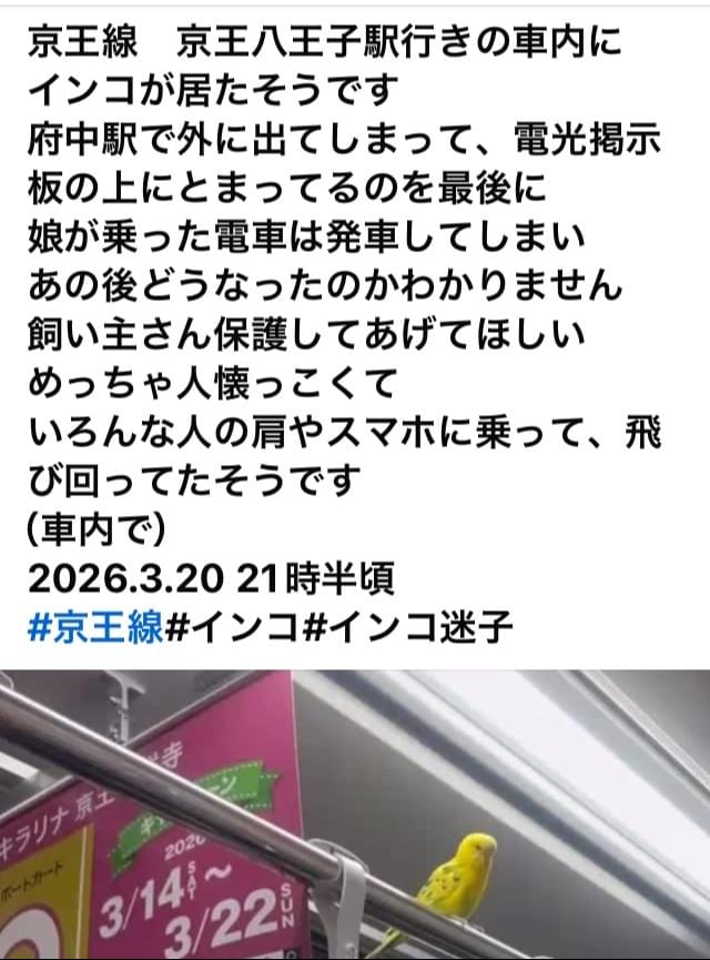 黄色いセキセイインコ迷子、至急拡散、京王線八王子市駅行き車内、府中駅