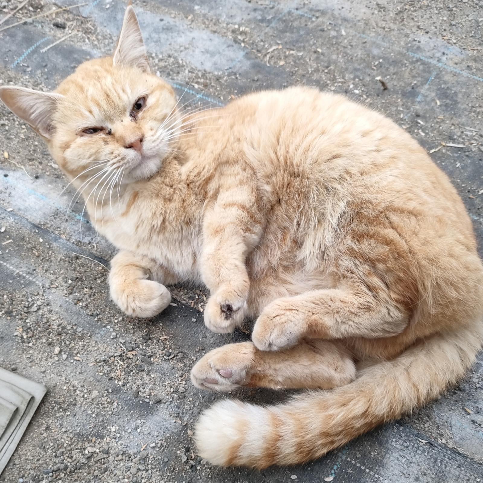 人が大好きで、人の気配を感じると、鳴きながら(うにゃうにゃとしゃべりながら?)うれしそうに寄ってきます。しゃがんで相手してやると、すぐにゴロンと横になります。とにかく人が好きみたいで、寂しがり屋です。