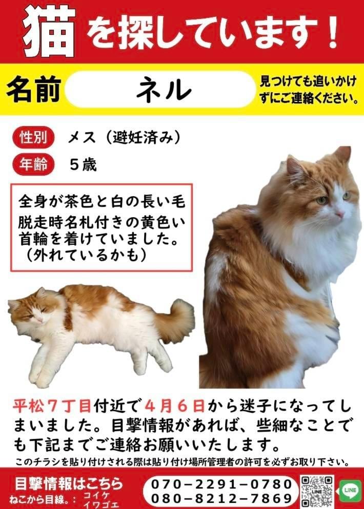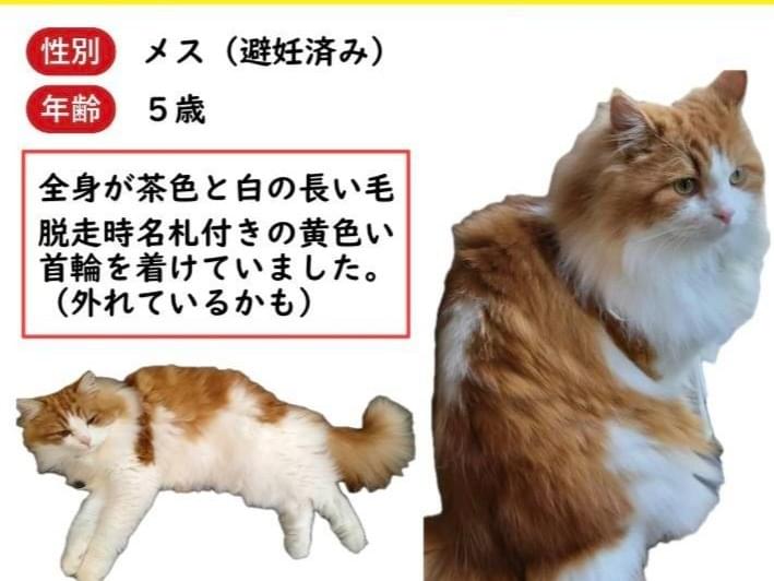 ふさふさの長毛の猫を探しています!色は茶色×白。脱走時に黄色い首輪をしてました(丸い銀のプレートがついており、「やまもと」と記名しています。)マイクロチップ装着済み。食べるのが大好きな子です。
