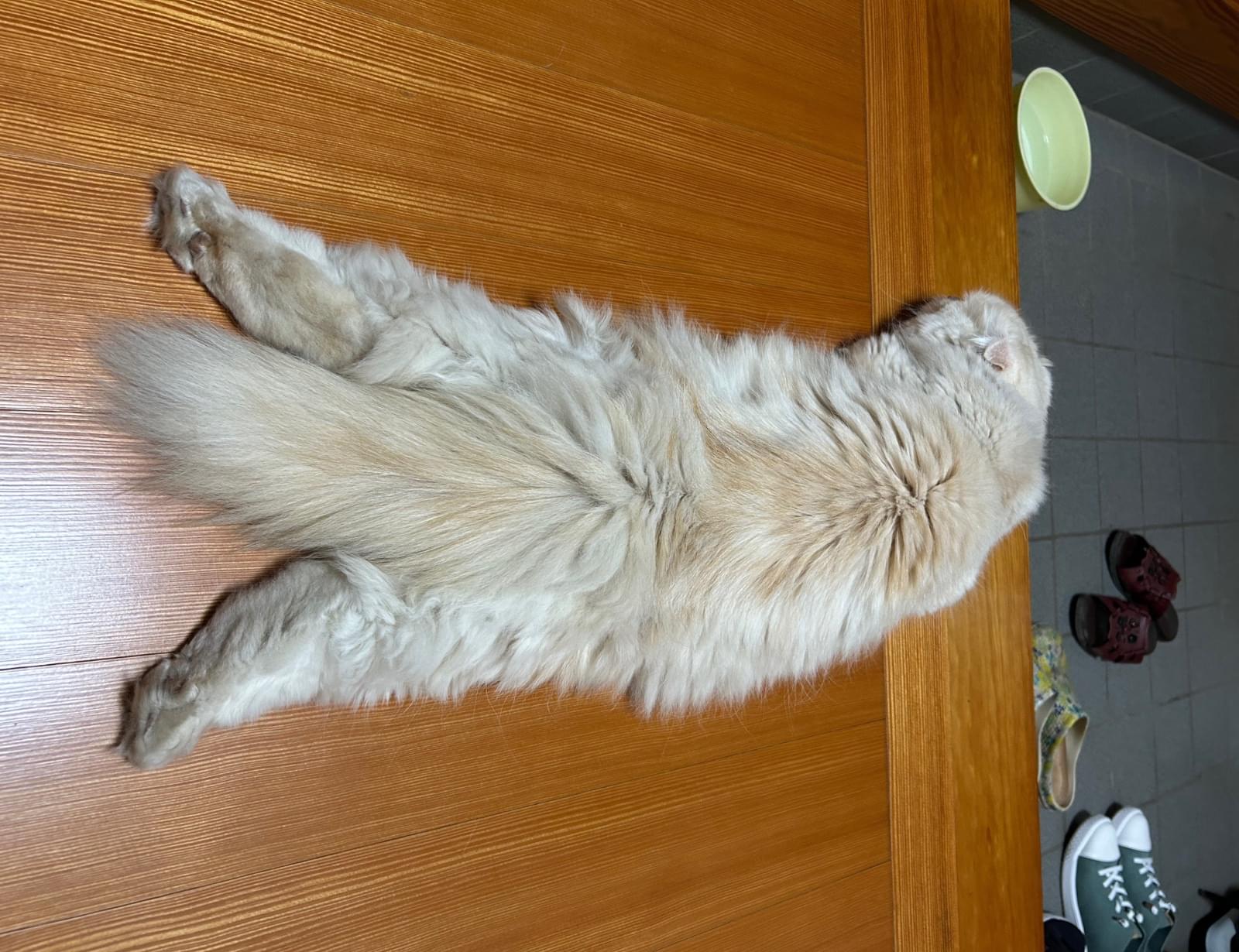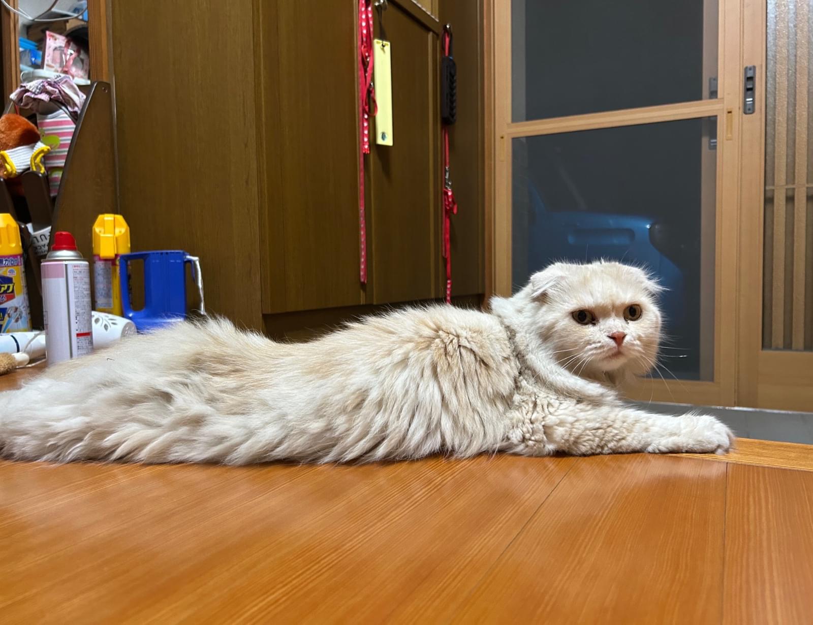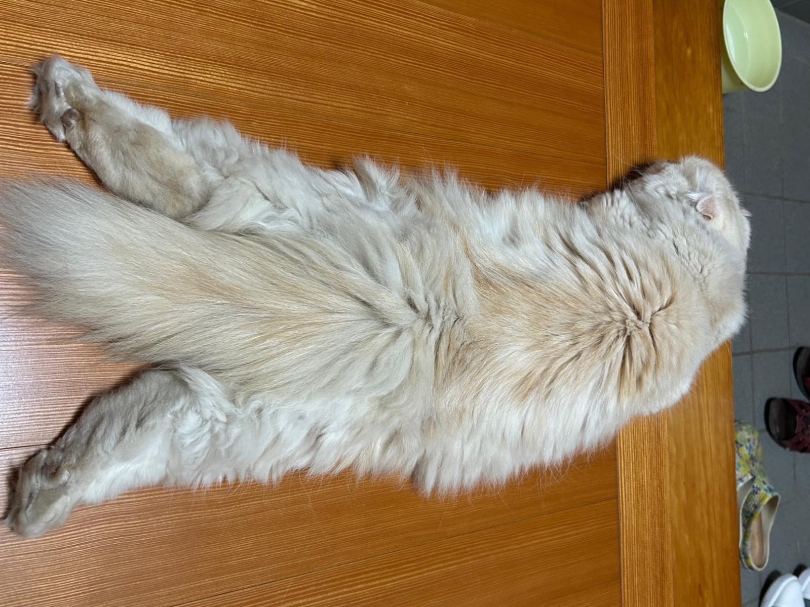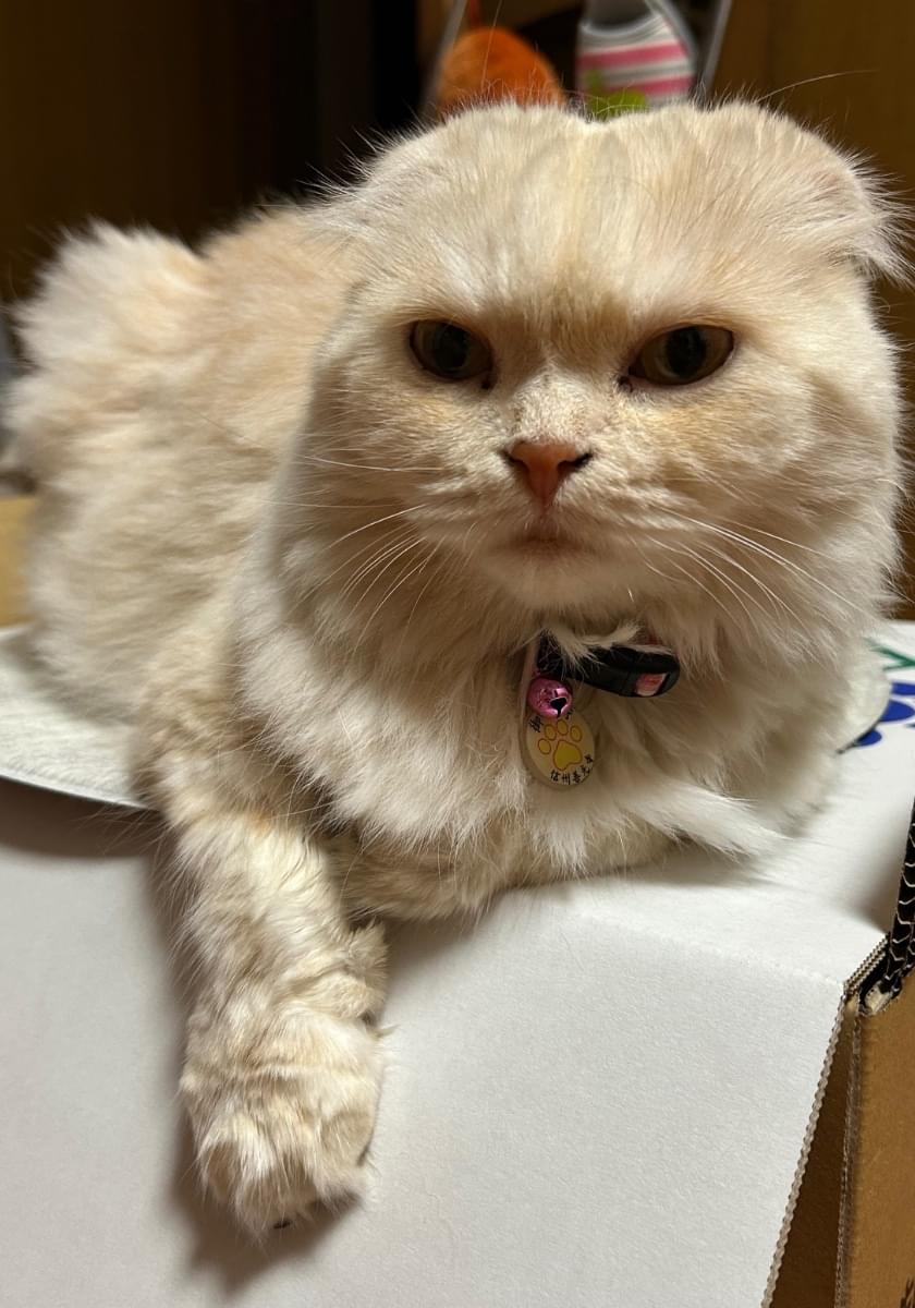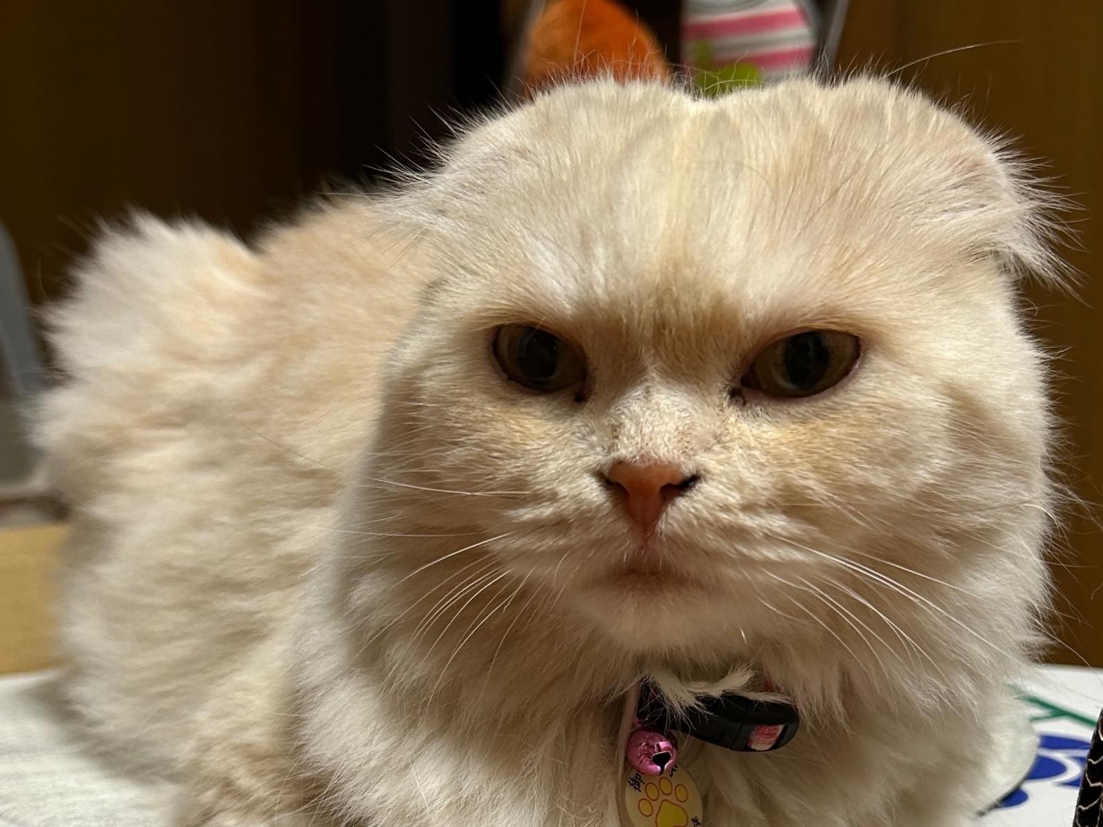 スコティッシュフォールド折れ耳で、長毛種です。毛色はクリーム色で、背中はうす茶色。音などに驚きやすく、臆病な性格です。
