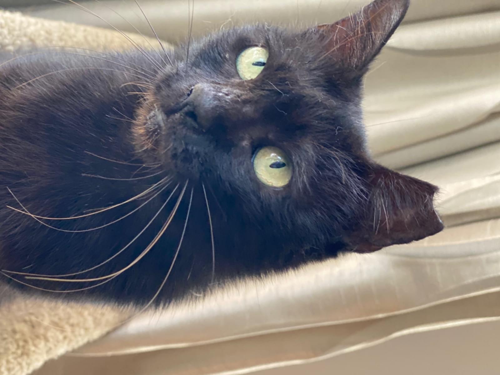 黒猫で鼻の周りにそばかすみたいに点々がちょっとあり、体重は4kg弱くらい。さくら耳の去勢済みの男の子です。