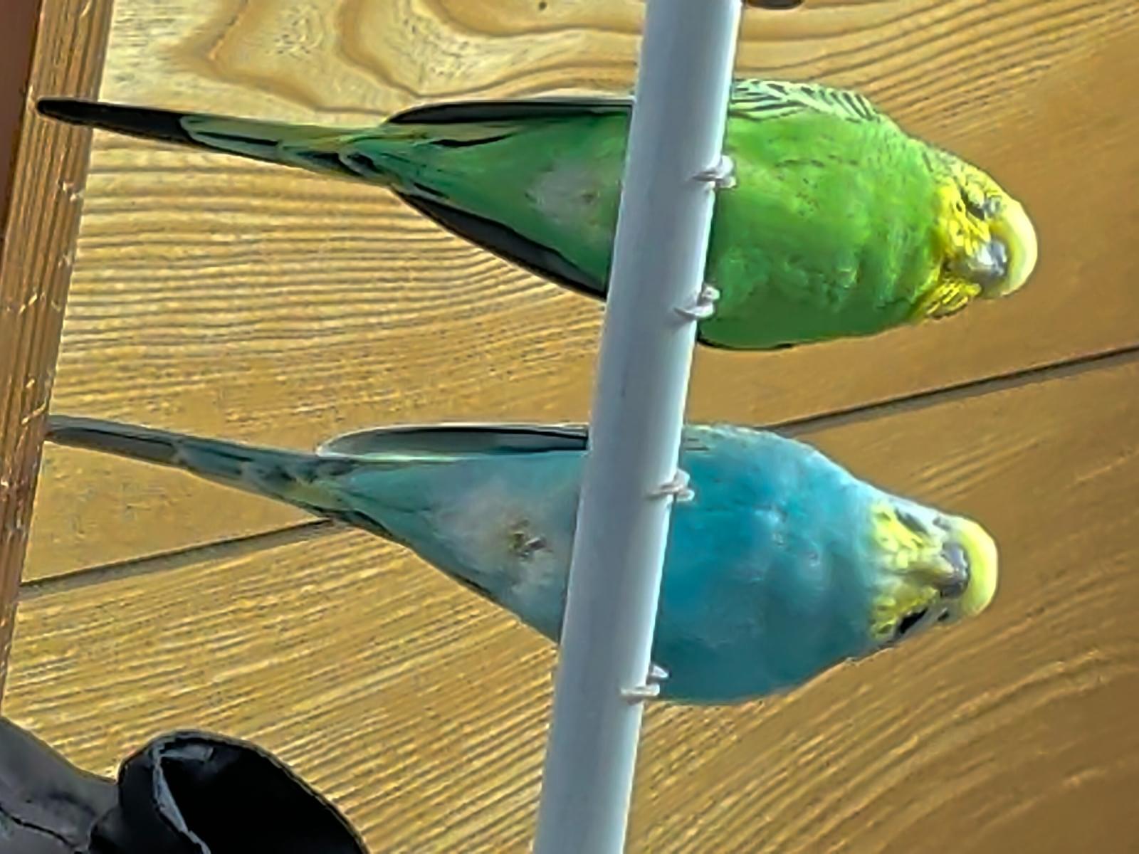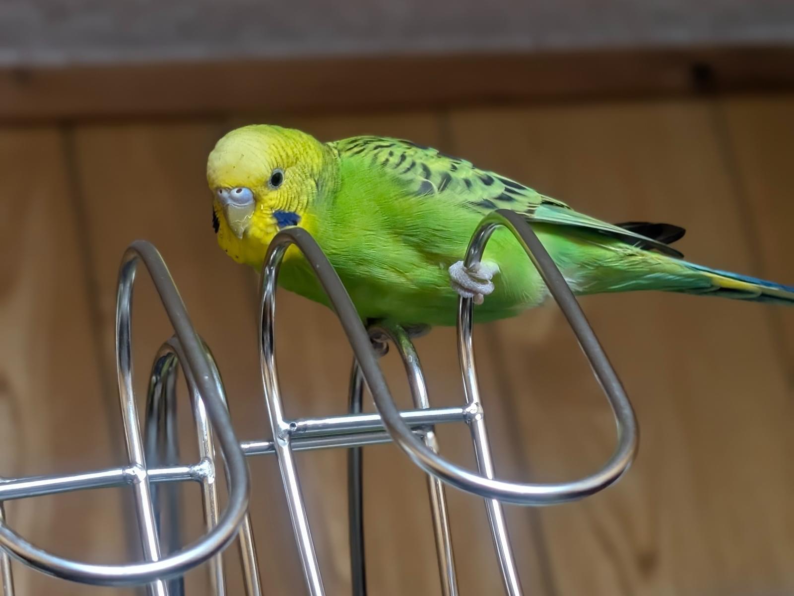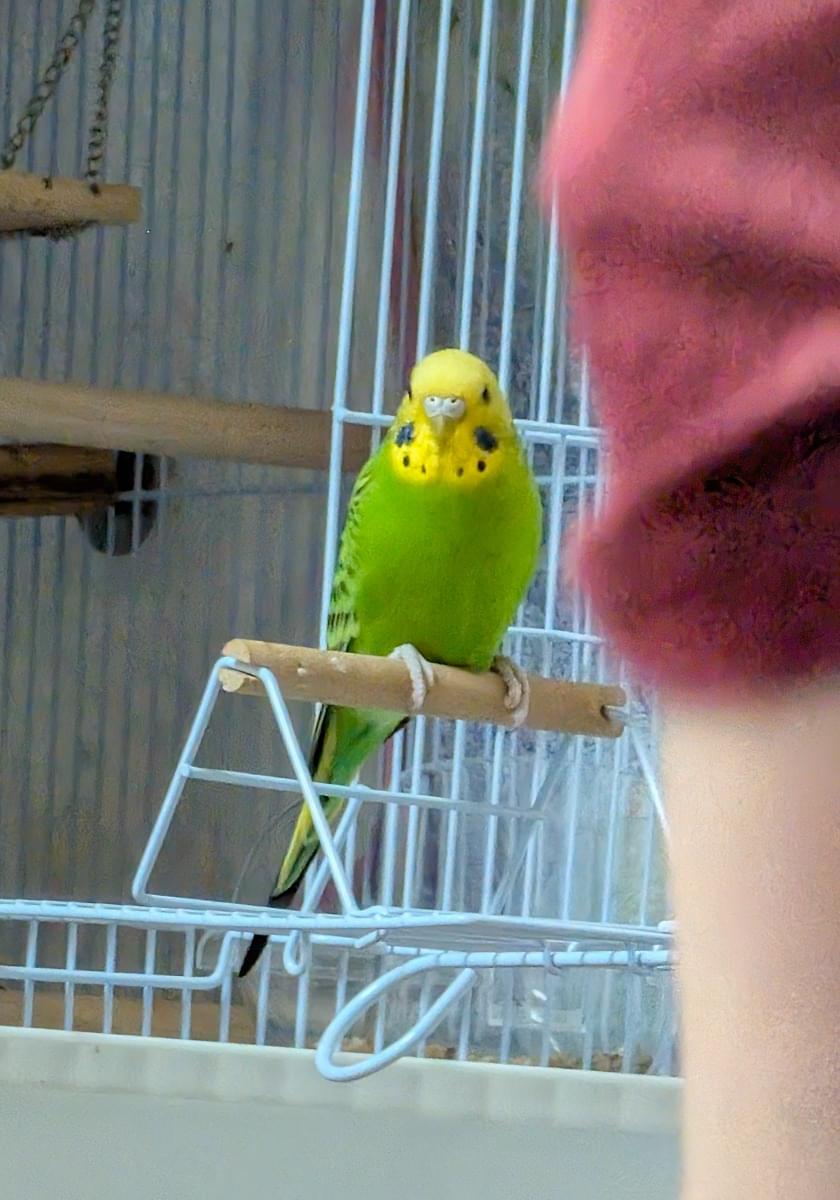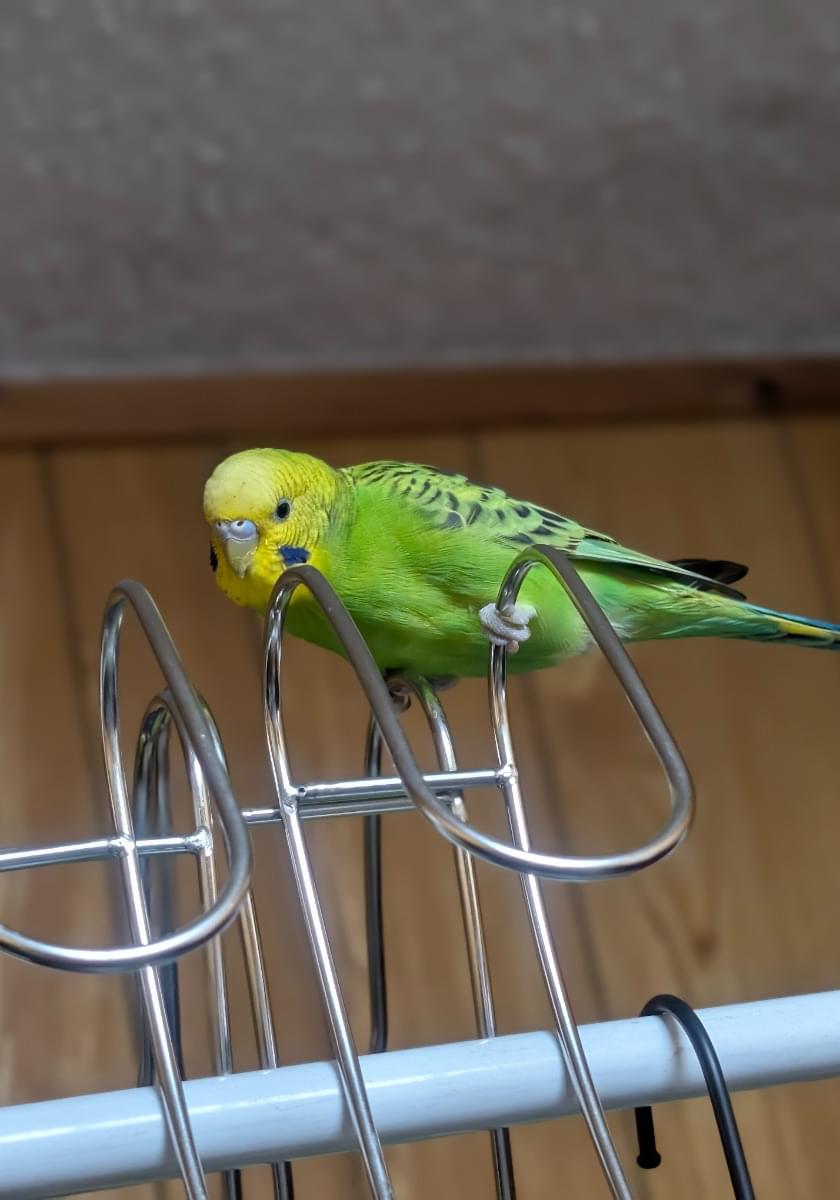 人馴れがほぼしてません。捕まえようとすると逃げます。頭が黄色で、身体が緑色で、尾羽根が青っぽいセキセイインコです。あまり鳴きませんが、鳴き声は高いです。怒りっぽく、低い声でジジジジや甲高い声でピピピピと鳴くこと事が多いです。