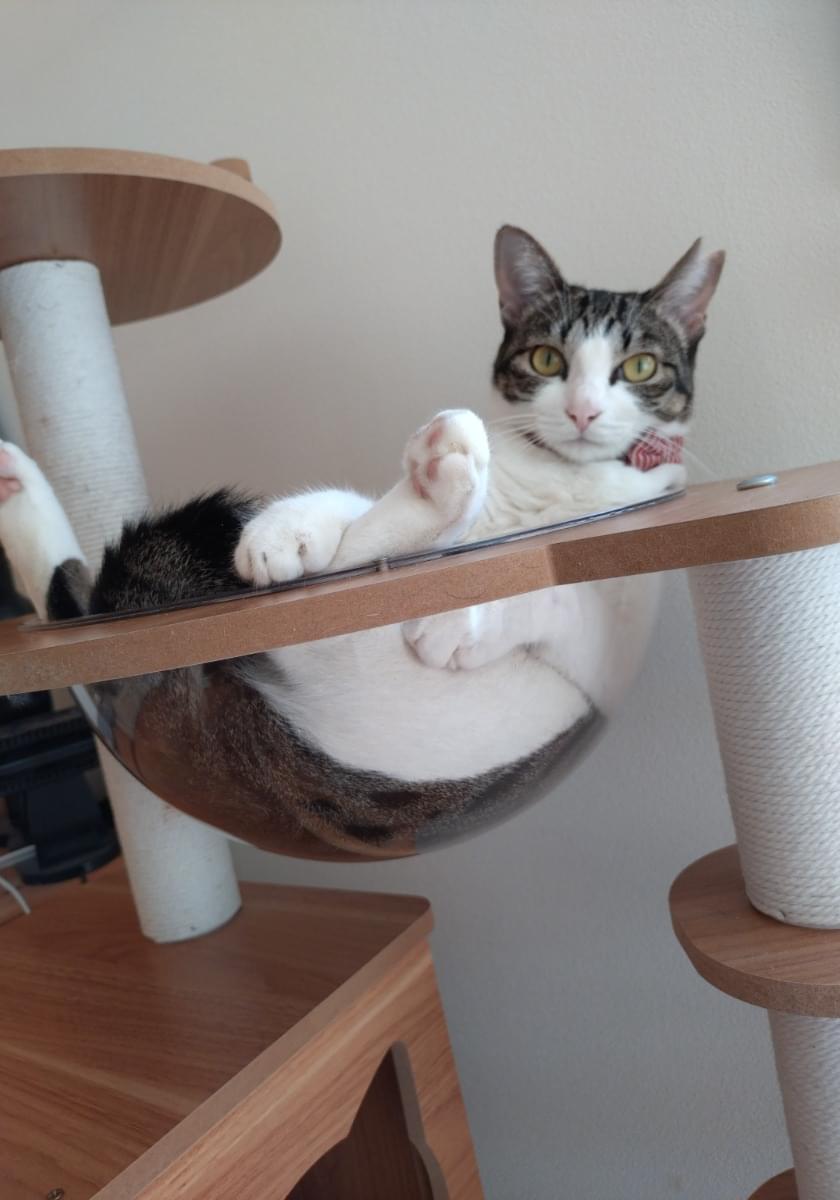 赤いくみひもっぽい鈴付きの首輪をしています。