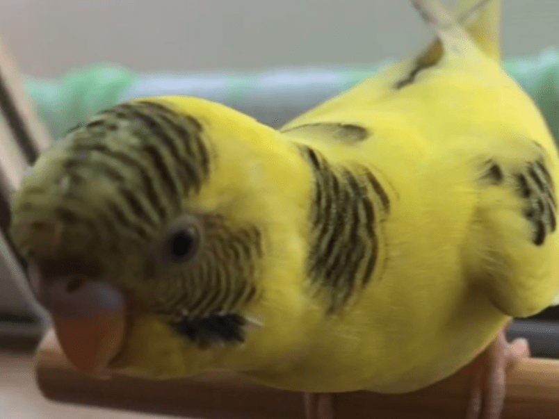 体全体が黄色ですが黒や背中に緑の大きな模様、お尻は白くて、マダラ模様です。尻尾の毛が抜けて短い。人間だと思っているので人間と同じことをしないと怒れたいする、感情のきふくが激しい。