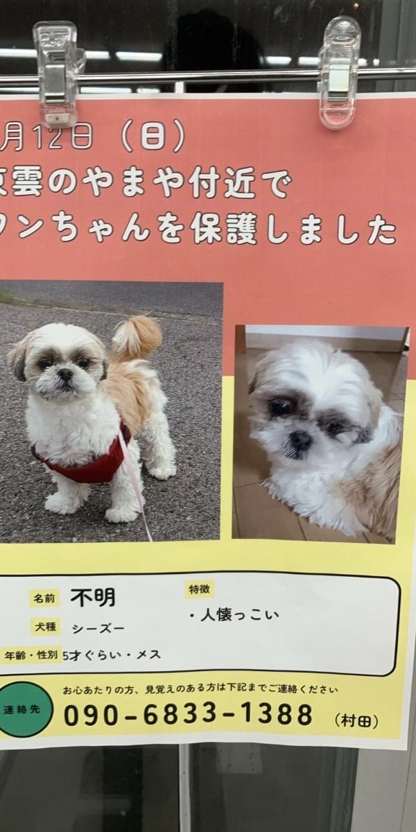 ホーム保護犬広島県シーズー 女の子 シーズー 女の子 管理編集するポスター掲載終了最終更新日時:2026/04/18 22:33写真情報用件保護性別メス年齢5歳くらい 人懐っこい場所広島県 広島市南区東雲1丁目発生日時2026年4月12日(日)保護者むらた説明シーズーの女の子 南区東雲のやまやの付近で保護 5歳位で、人に懐っこく ピンクのリードどなたか?このシーズーちゃん みた事ある人いませんか?連絡先URL未設定掲示板情報交換のための掲示板です。ユーザーからの情報提供、オーナーからの連絡などにご利用下さいませ。まだコメントはありません。トピックを作成する