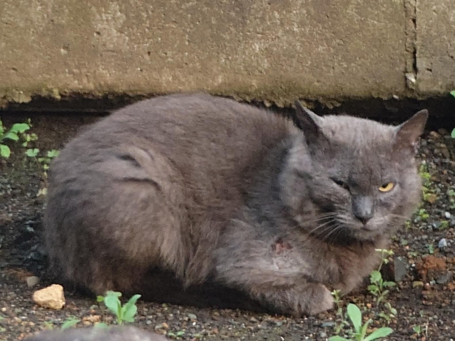 どこかの家で飼われてるのかもと思いましたが、足に怪我らしきものがあって、いつまでも治療されていないので心配です。(アレルギーがあるのと、警戒心強く近寄れません)