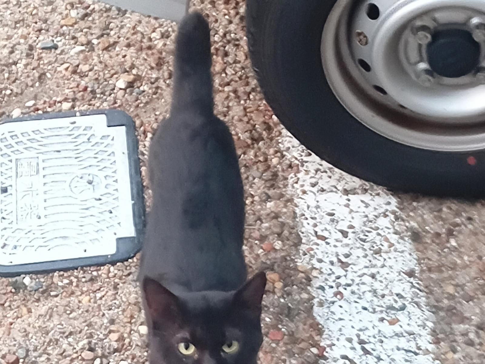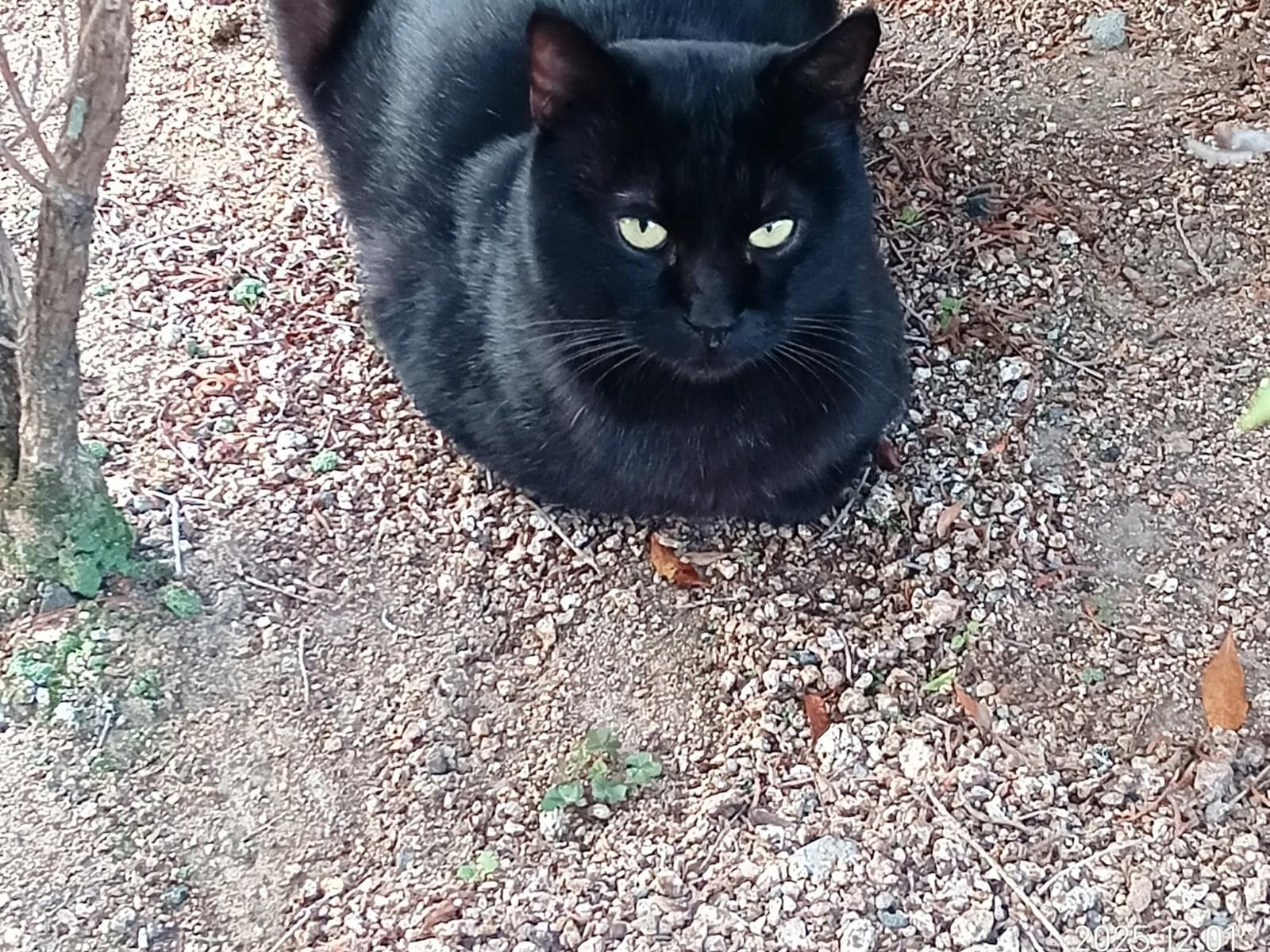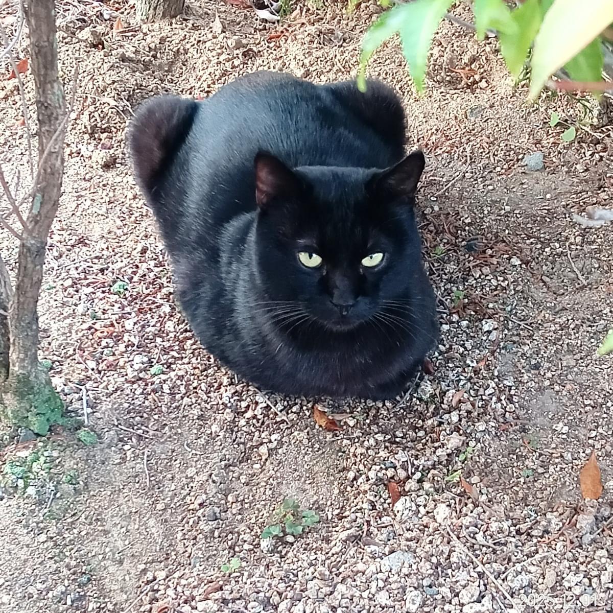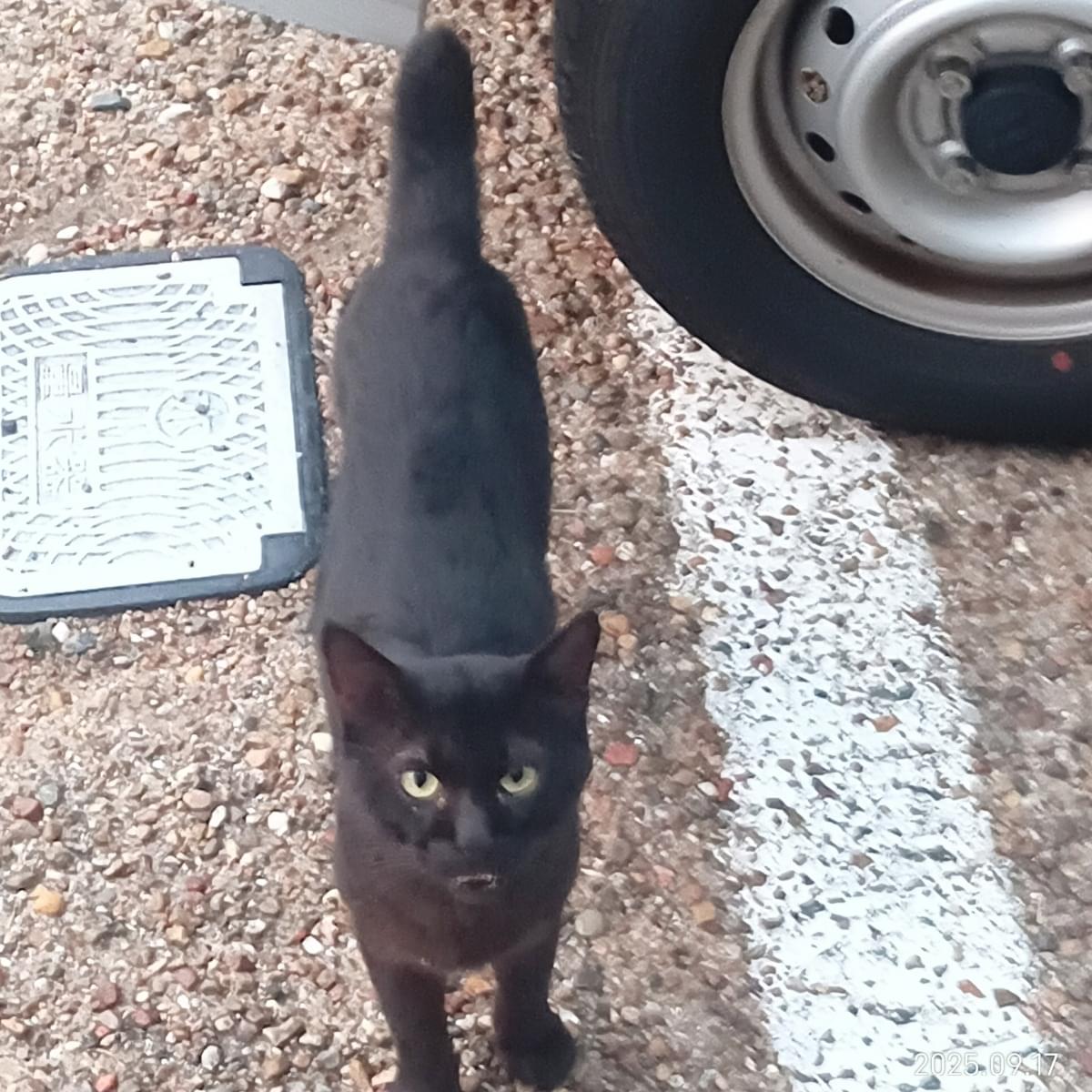 黒猫で5歳ぐらいの尻尾が太く短い子です。鳴き声も特徴が有りあ〜うんと言うような鳴き声です。