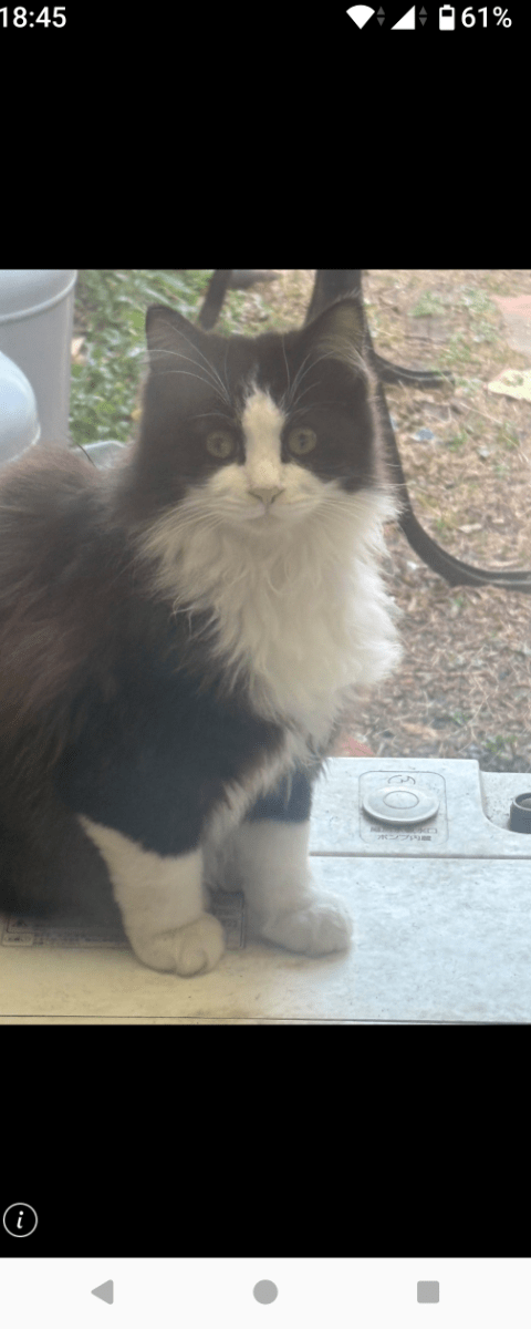毛の長いハチワレです。体重は5キロ位で右耳がカットしてあります。足が太いです。失踪当時は水色の首輪(引っかかると外れるタイプ)を付けていました。首輪に直に名字と携帯番号が書いて有ります。
