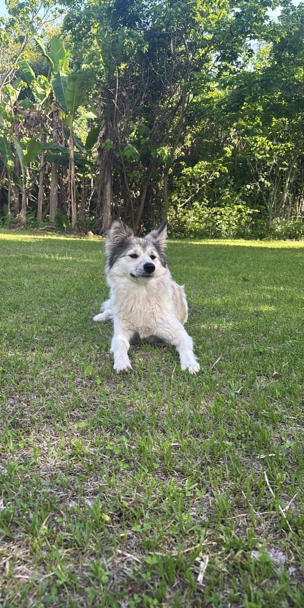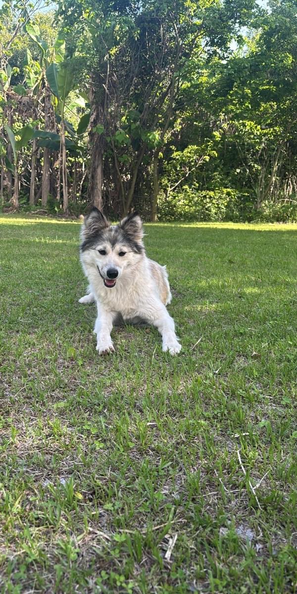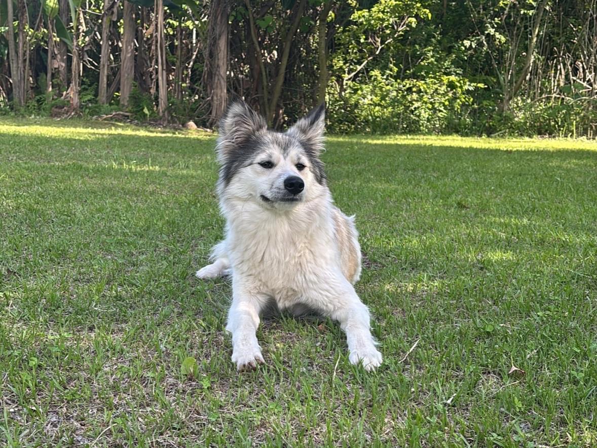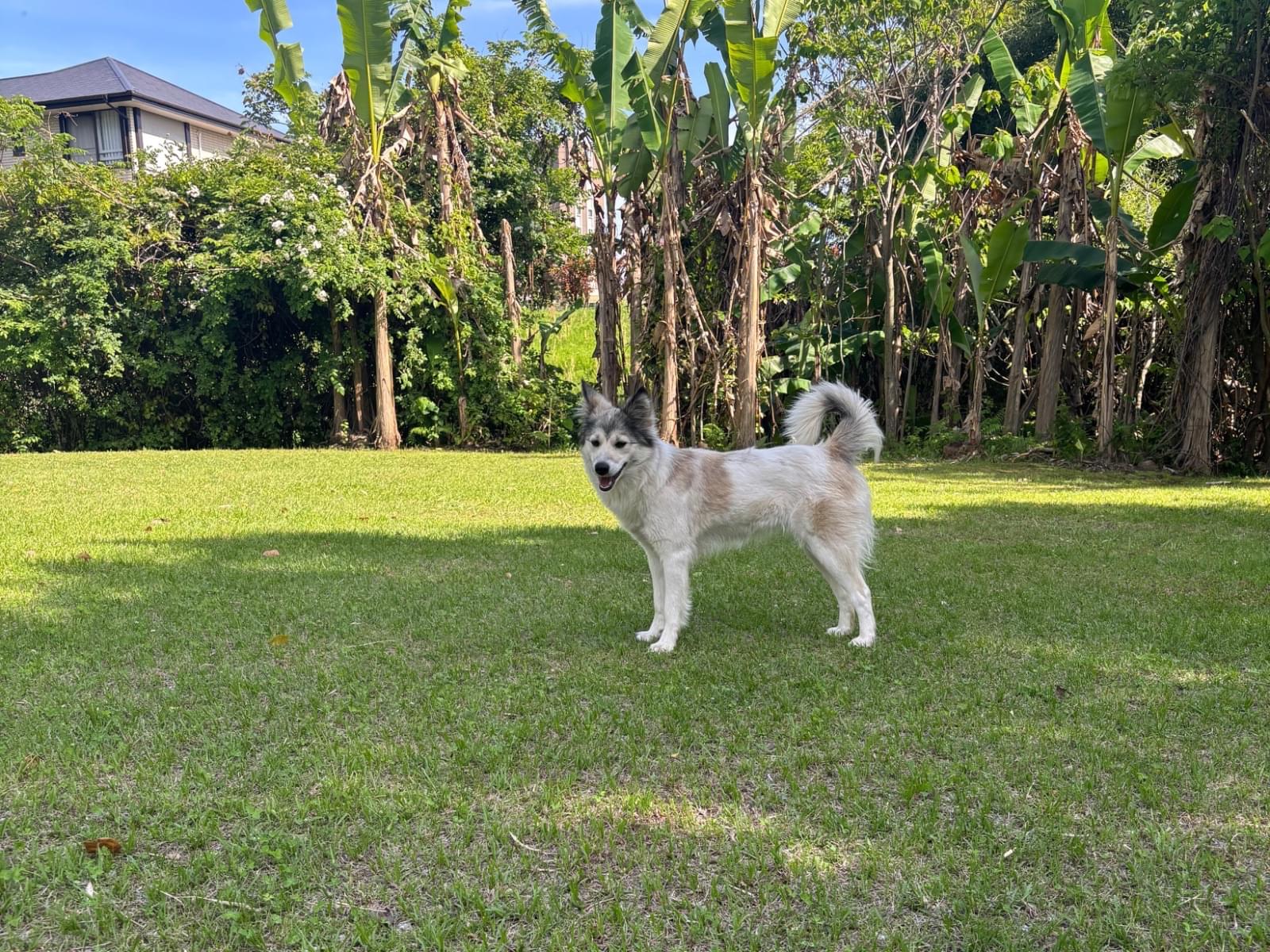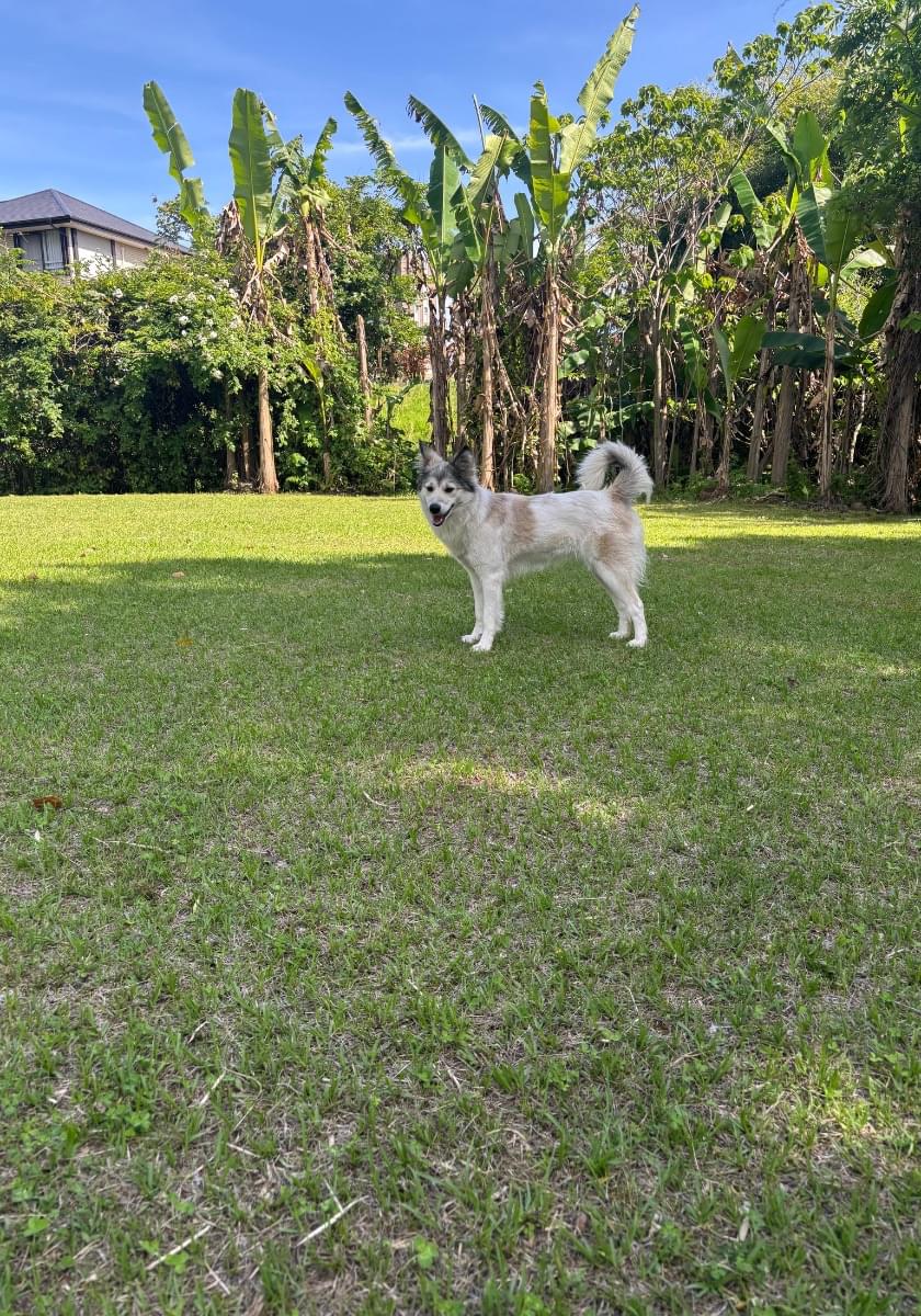 江津湖公園で白に茶色と黒が混ざった中型犬を見ました。首輪はつけていません。