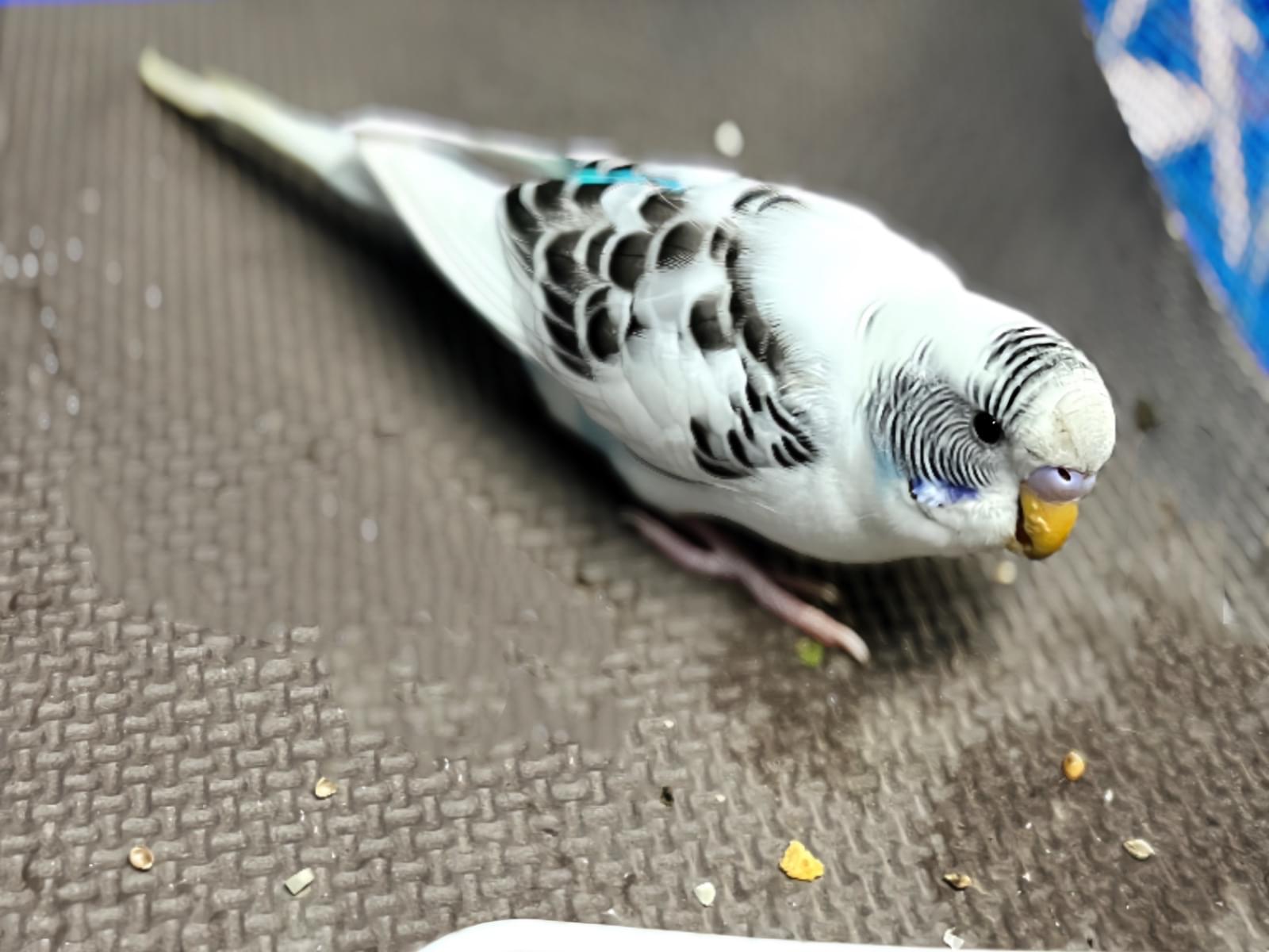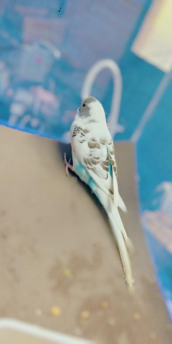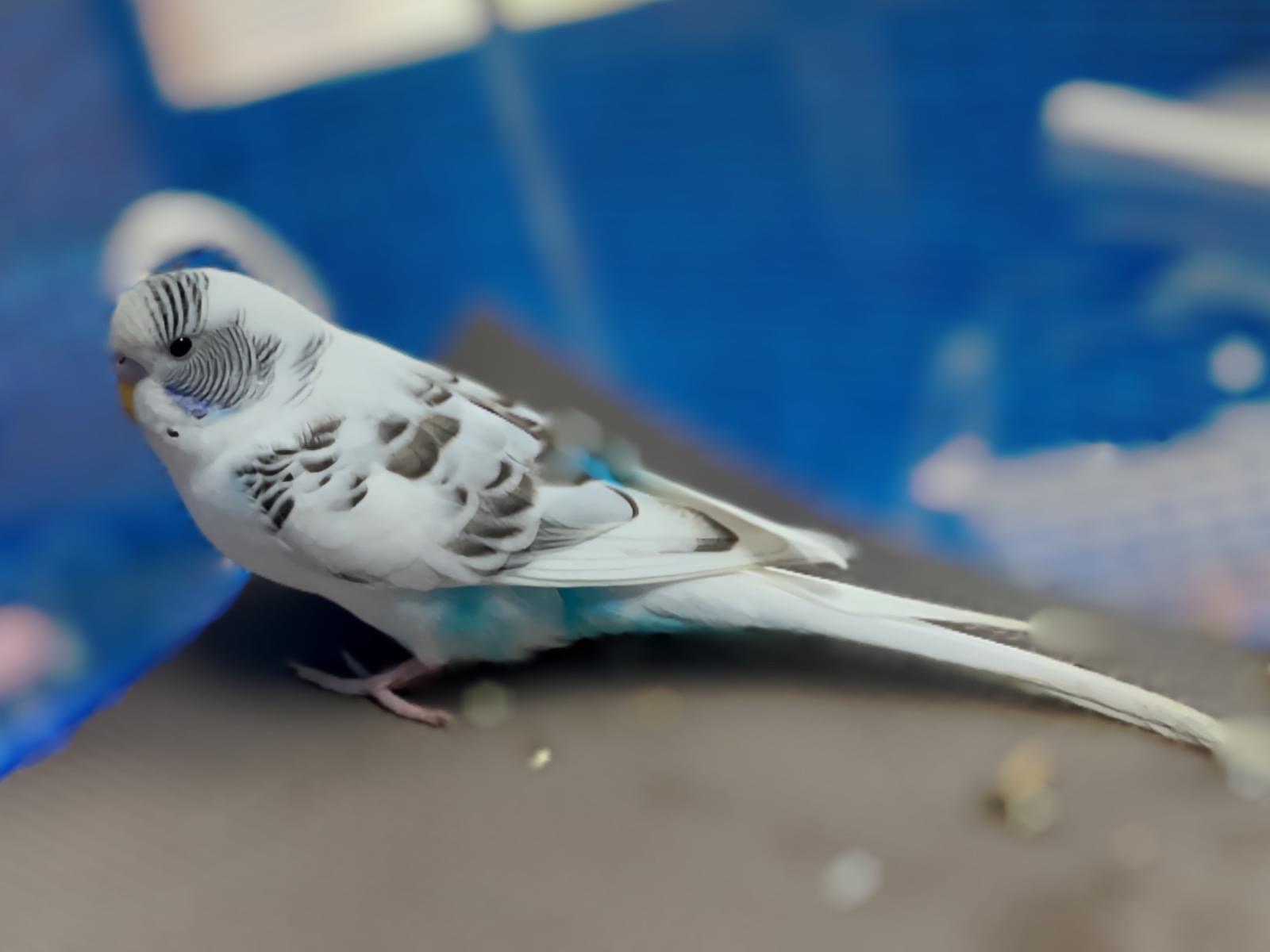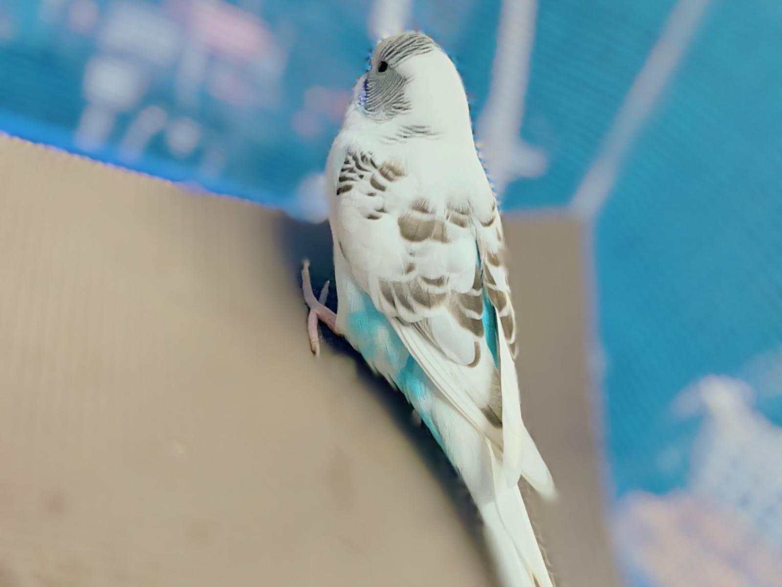 セキセイインコ、白基調、お腹と背中に薄い水色