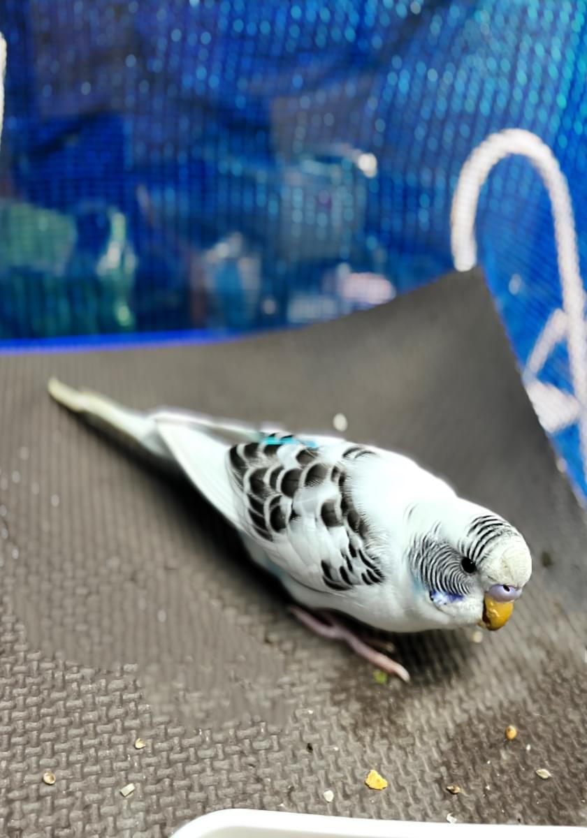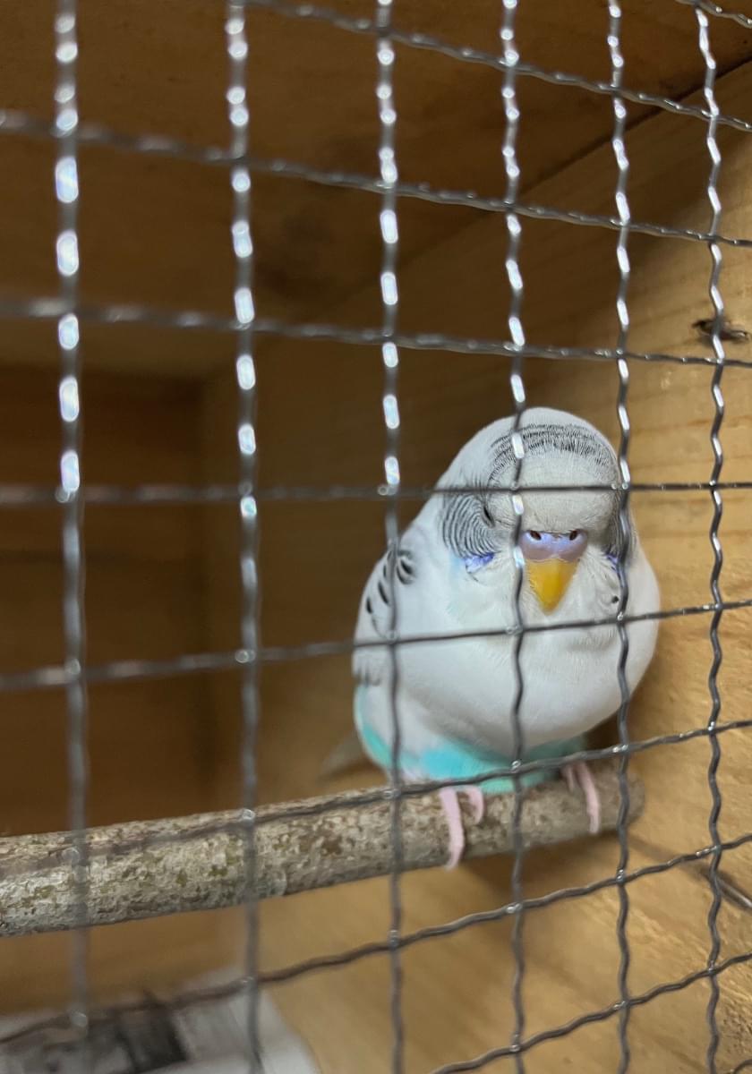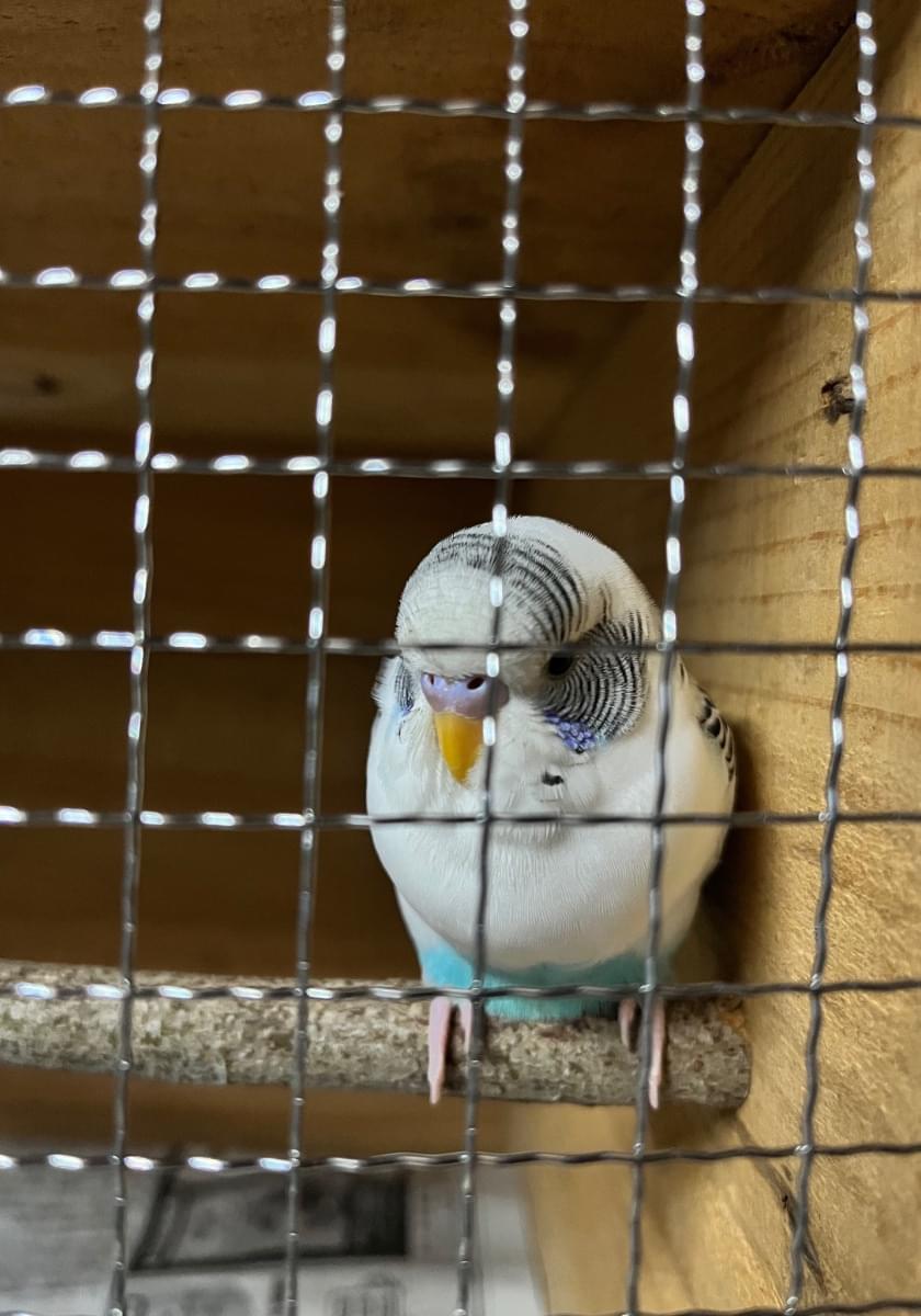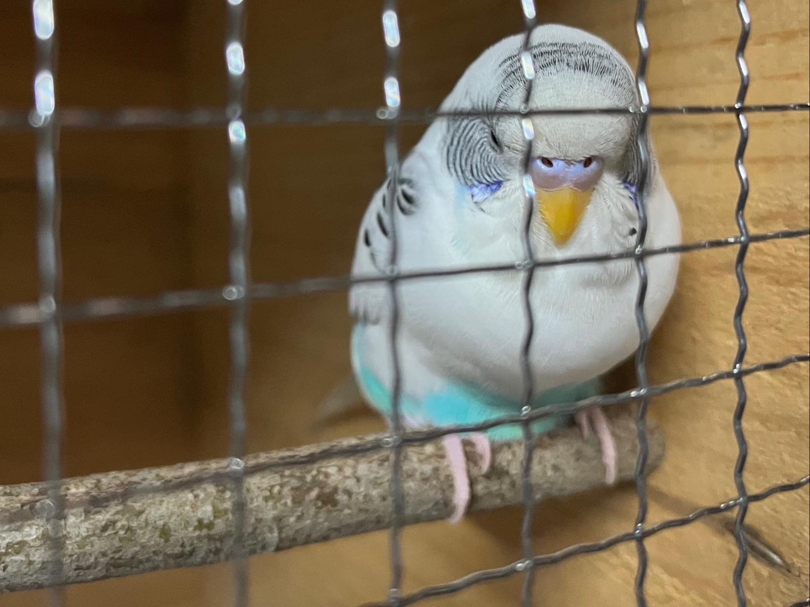 セキセイインコ、白基調、お腹と背中に薄い水色