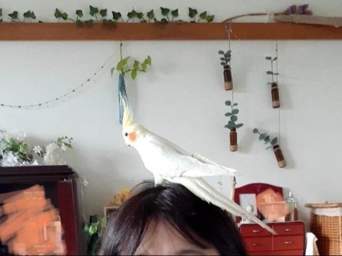 とても臆病ですが、手のりインコなので肩や頭に乗るのが好きです。
