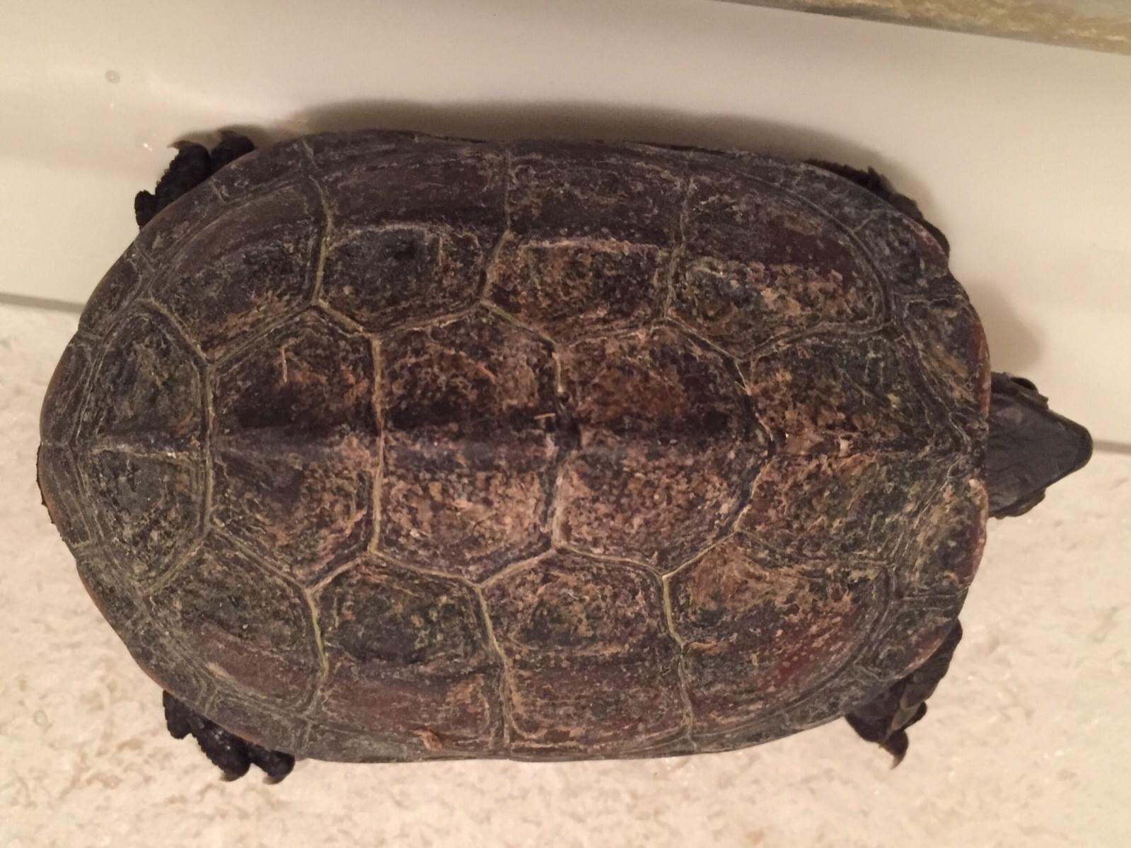 片手でつかめるサイズの亀。おそらくクサガメかゼニガメ(詳しくないのでわかりません)