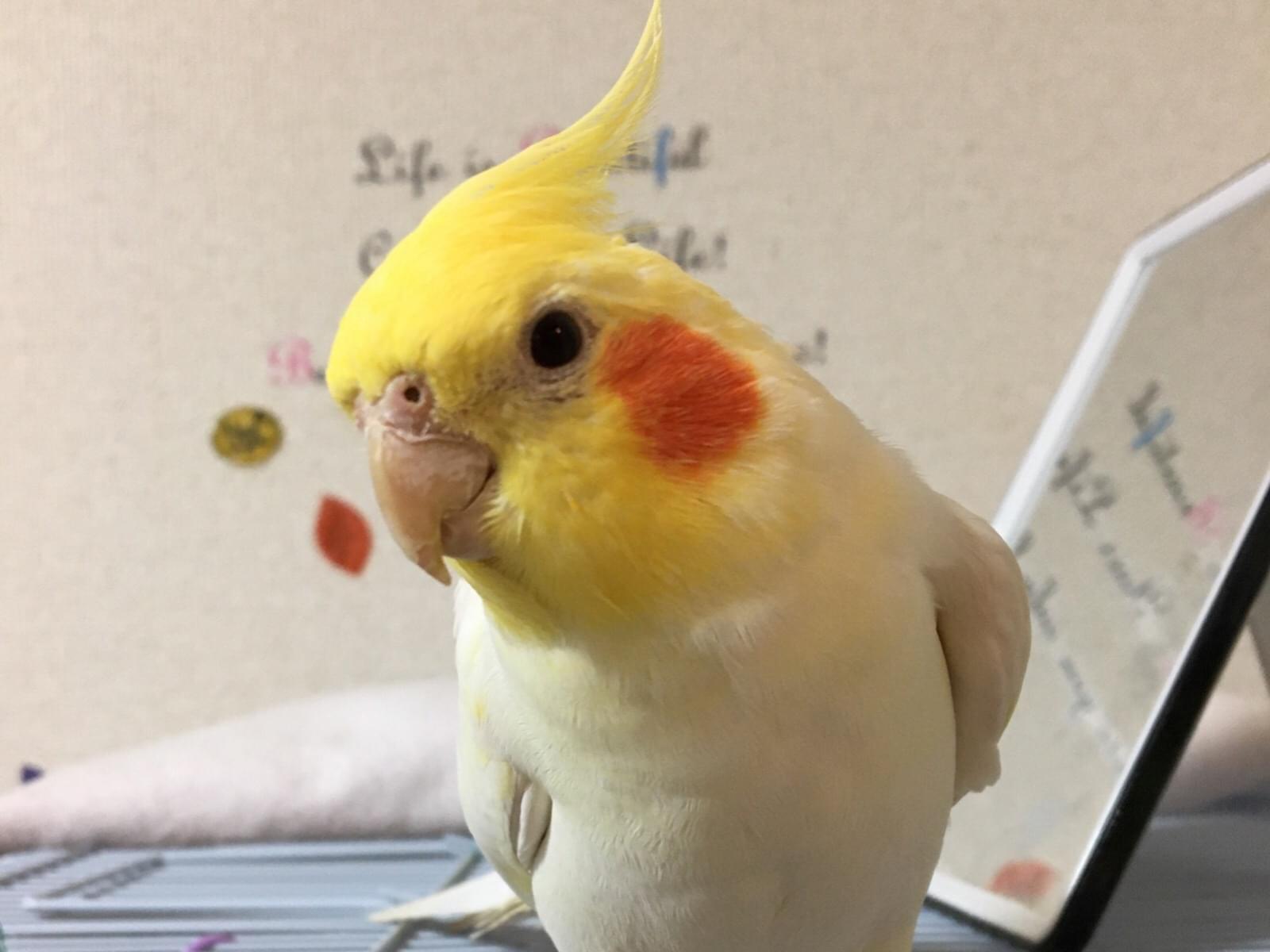 オカメインコのルチノーで、顔が黄色に体はクリーム色、頬がオレンジ色の男の子です。