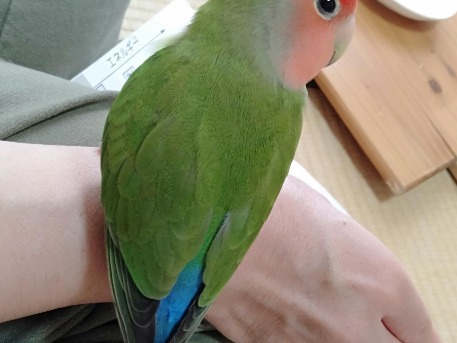 手のりで人見知りがありません。外出先で肩に飛び乗って来ました。少しおしやべり(名前と思われます。○○ちゃん)出来るようです。