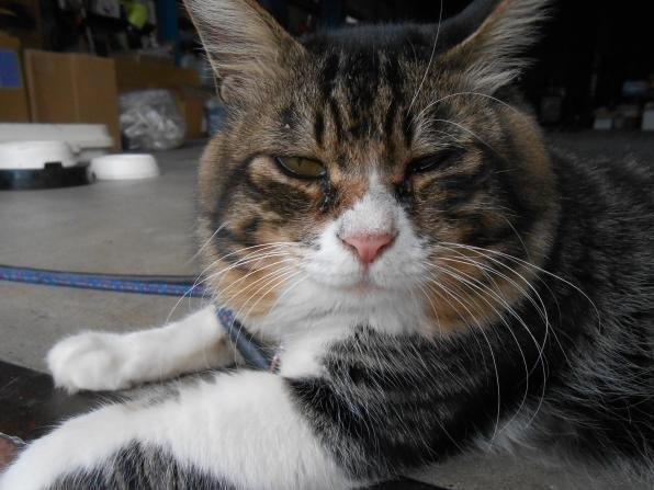 ・角膜黒色壊死症の治癒段階の為、左目が少し白く曇っています。