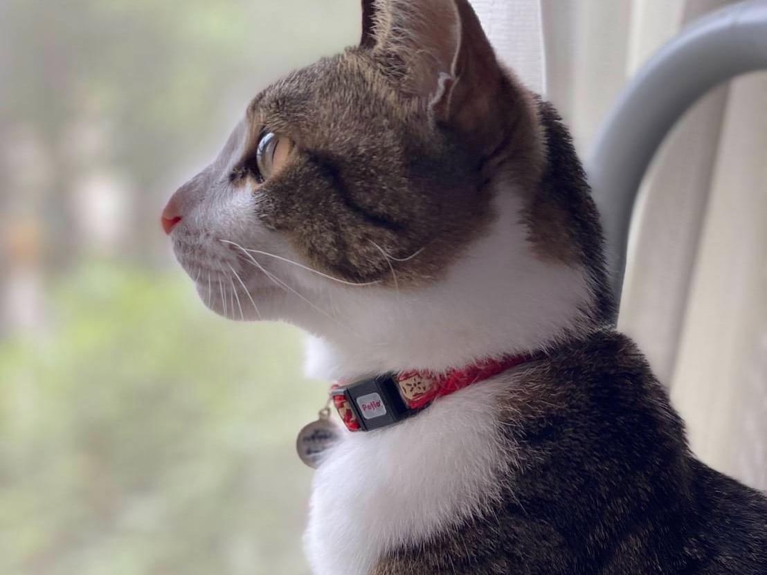 赤い首輪をしていて、白と茶色の猫を探しています。