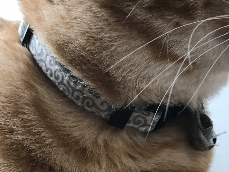 首輪は、100円均一のもので、白地にグレーの唐草模様。首輪がゆるかったので、グレーゴム部分を手で縫ってあります。