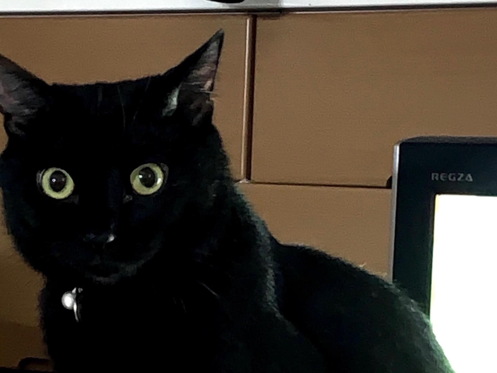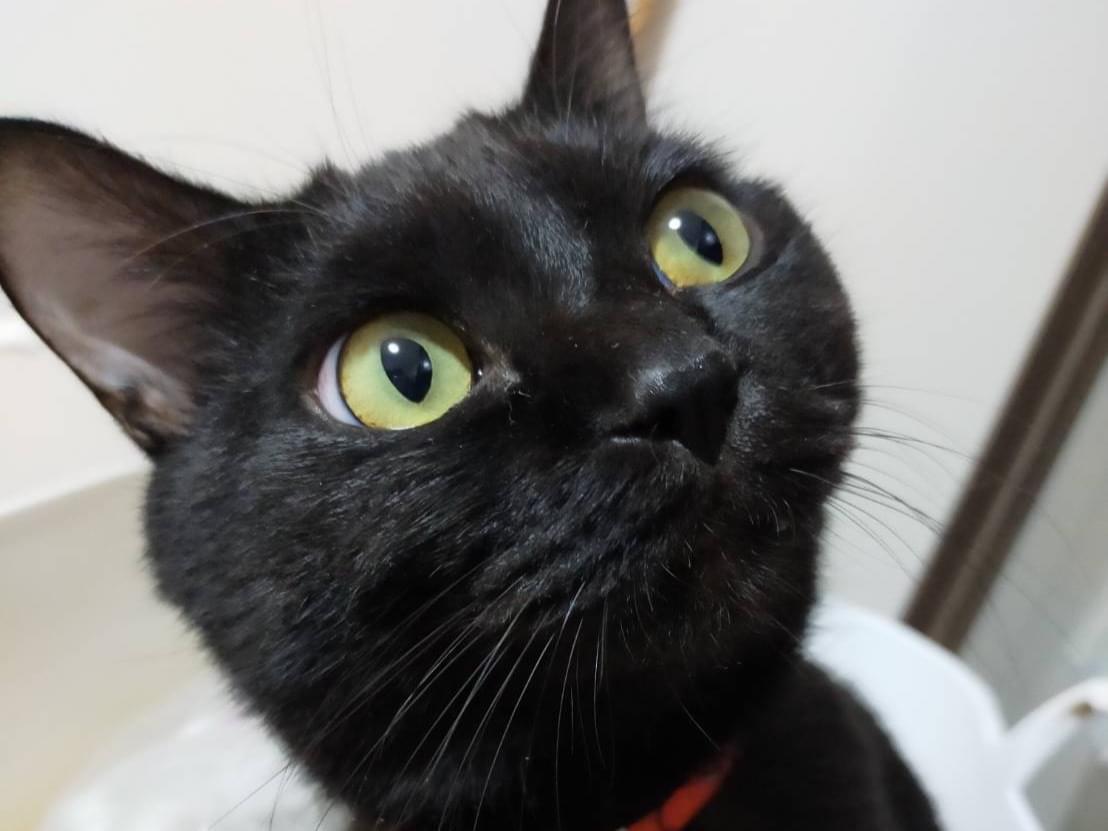 黒猫オス(去勢済み)、鈴つきの赤い首輪しています。首輪に小さな飾り札があり飼い主苗字+トトと黒字で書いてあります。