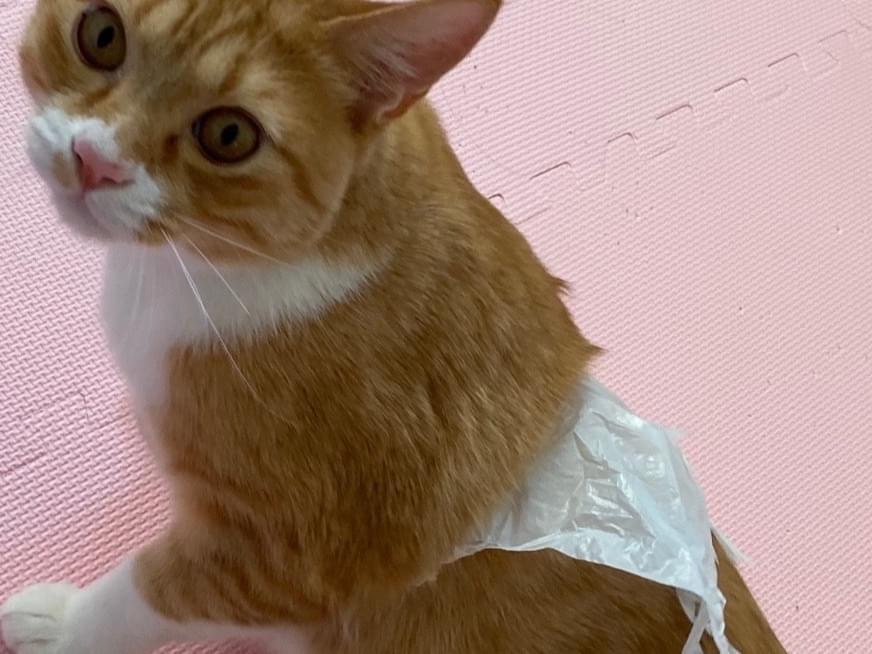 茶とら白猫去勢済みのオスです。首輪はついてません。鼻と肉球はピンクです。手足は白です。