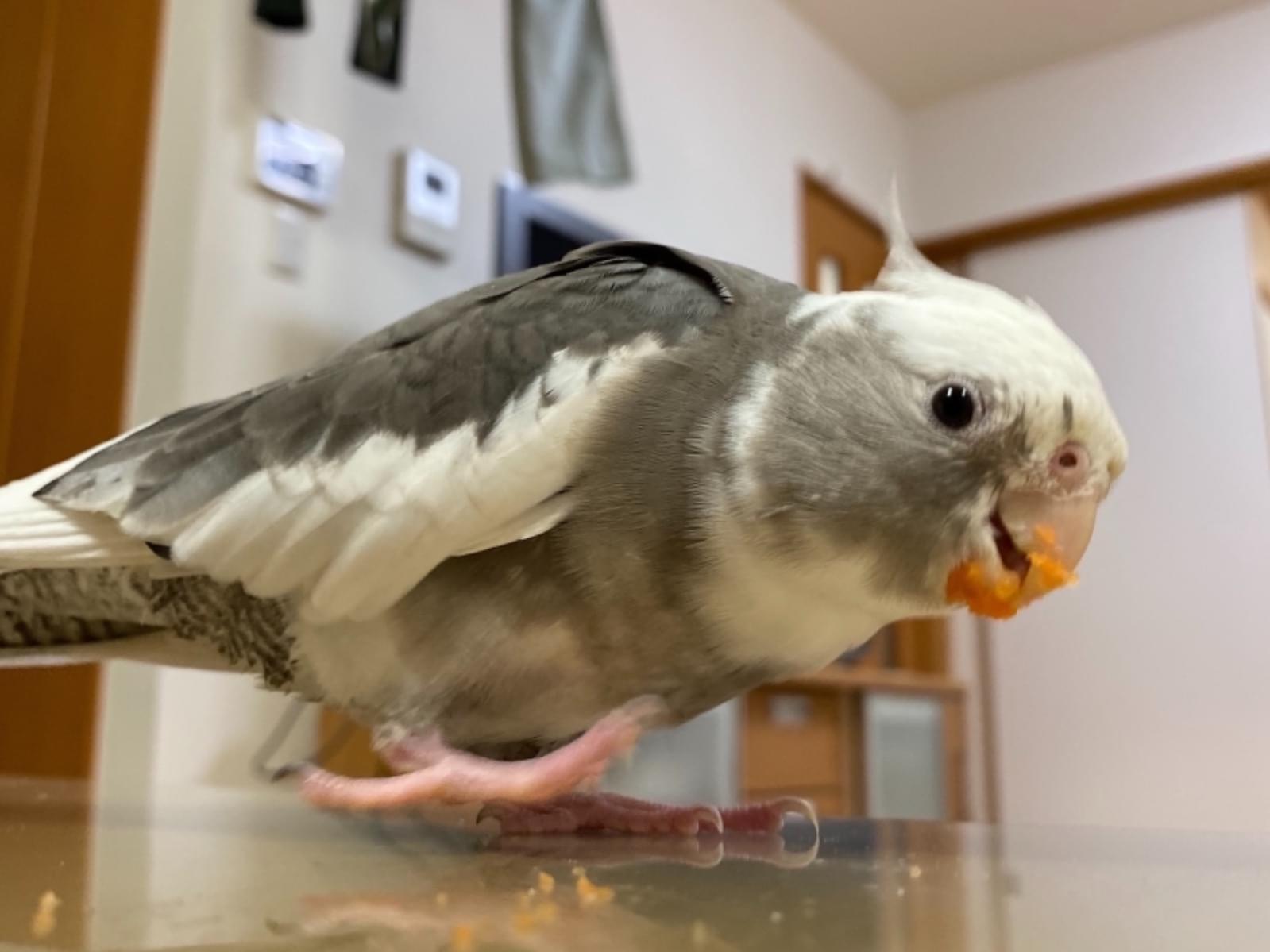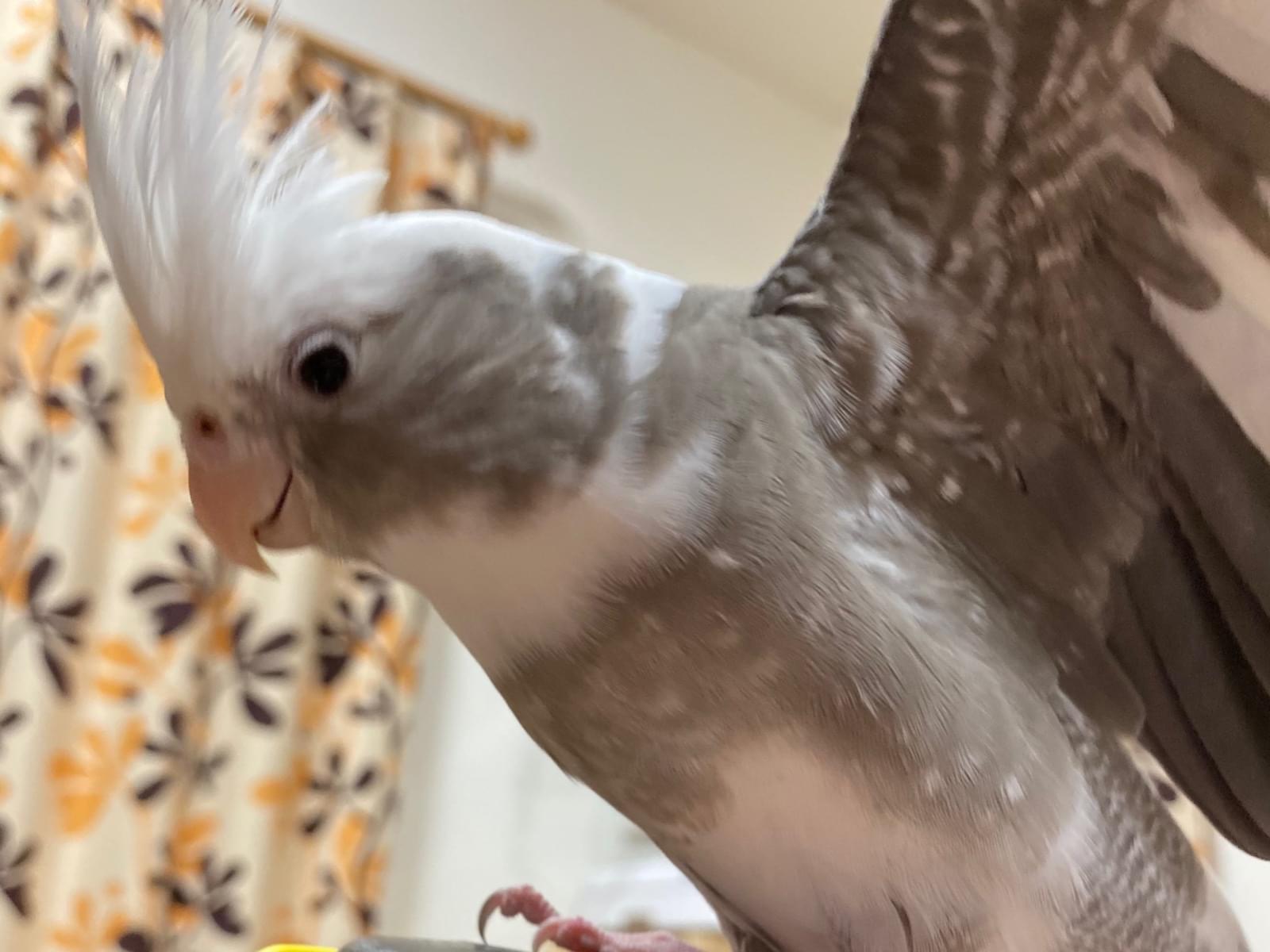 オカメインコ、パイド、ホワイトフェイス、目から下がグレー、目の上にホクロのようなグレー模様あり、口笛の真似とかはできない、肩・指先・頭によくとまる人懐っこいが臆病