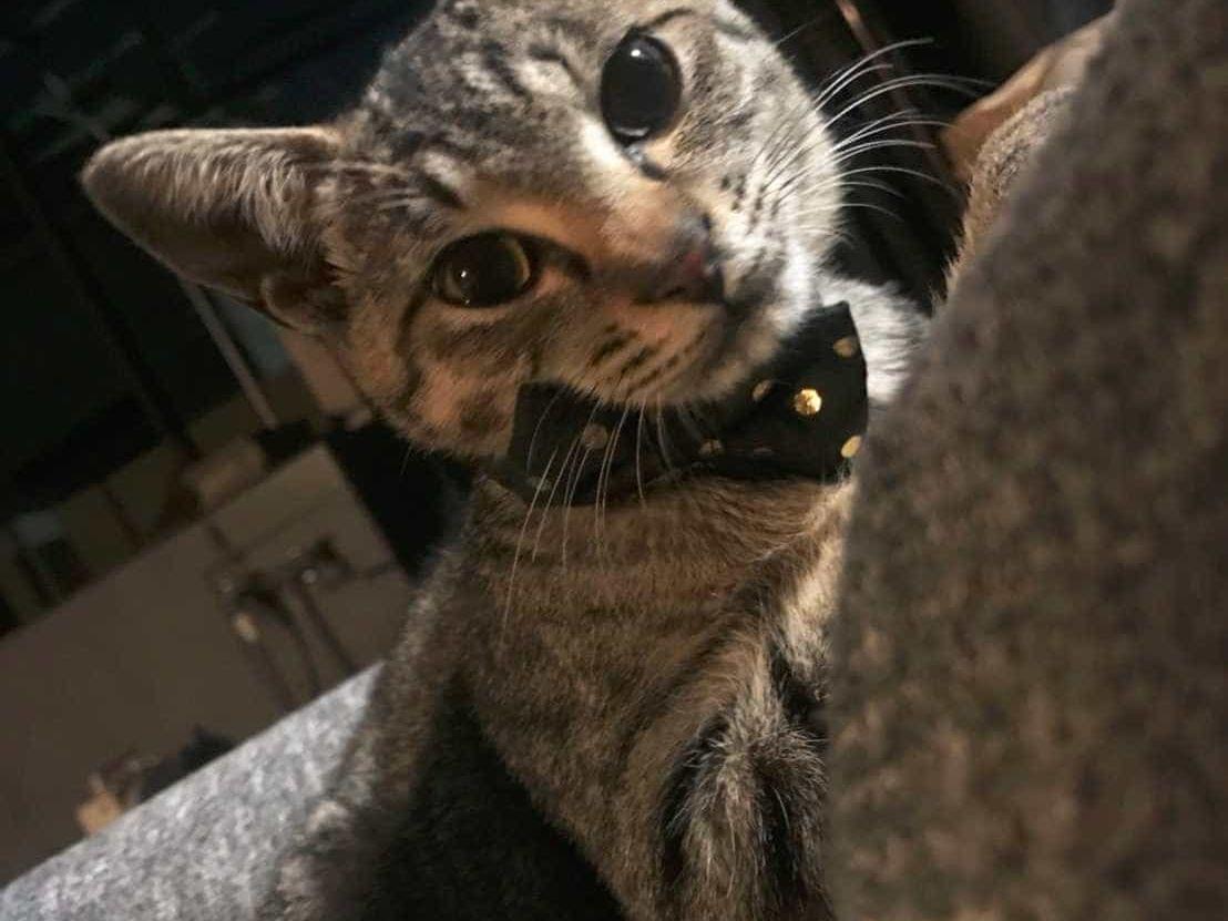 その他特徴:首に黒地、金色の水玉模様リボンの首輪