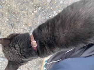 我が家の迷子猫を探していたところ、阿見町に、赤の和柄の首輪をした、黒猫ちゃんを見つけました。