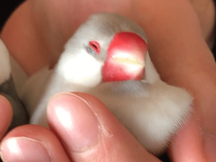 身体はほとんど白く、くちばしがピンク、頭の部分が薄いグレーの文鳥です。お腹のふちはほんのりベージュ色です。