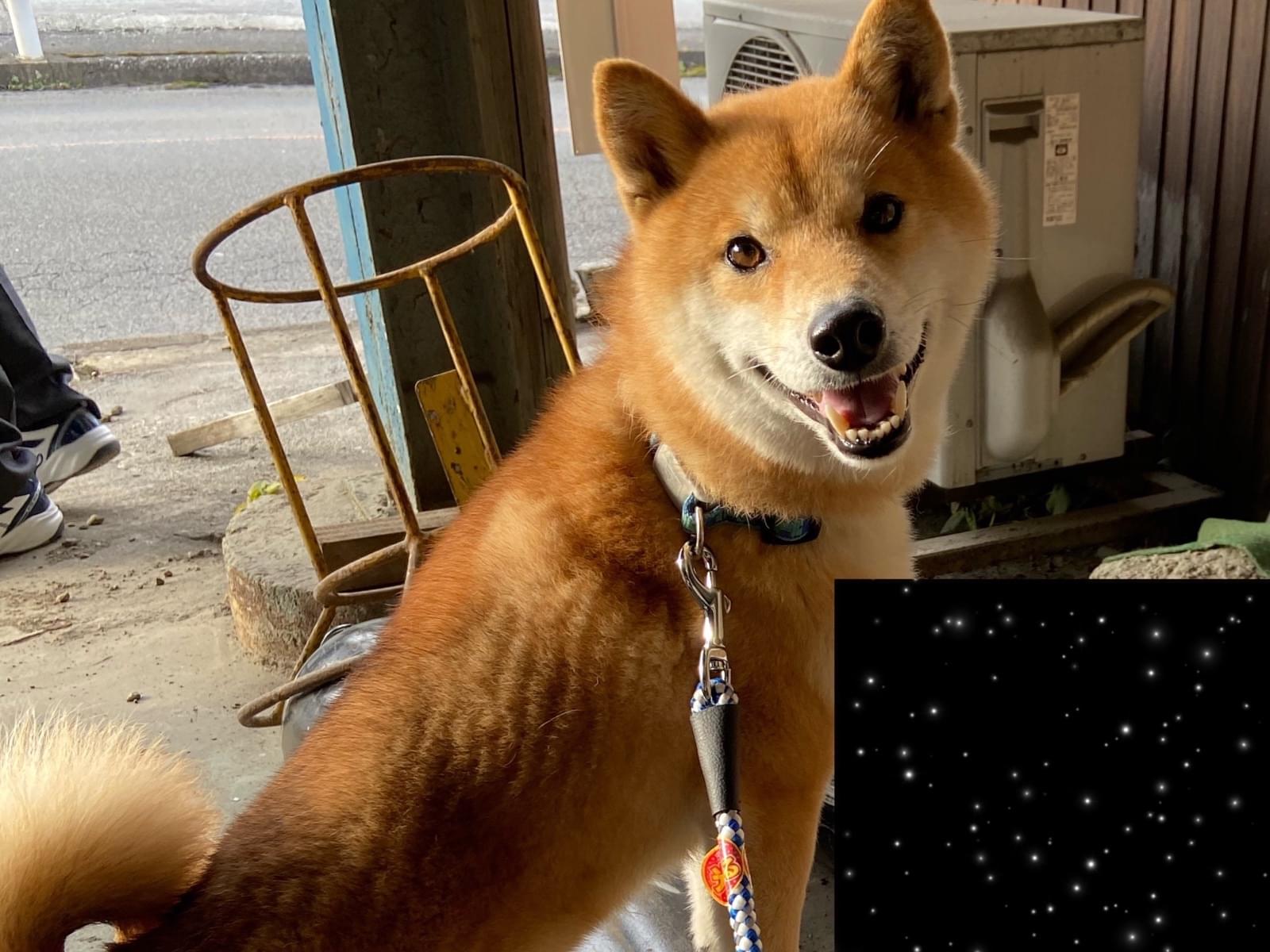 青色の骨の柄の首輪をつけた柴犬保護してます。
