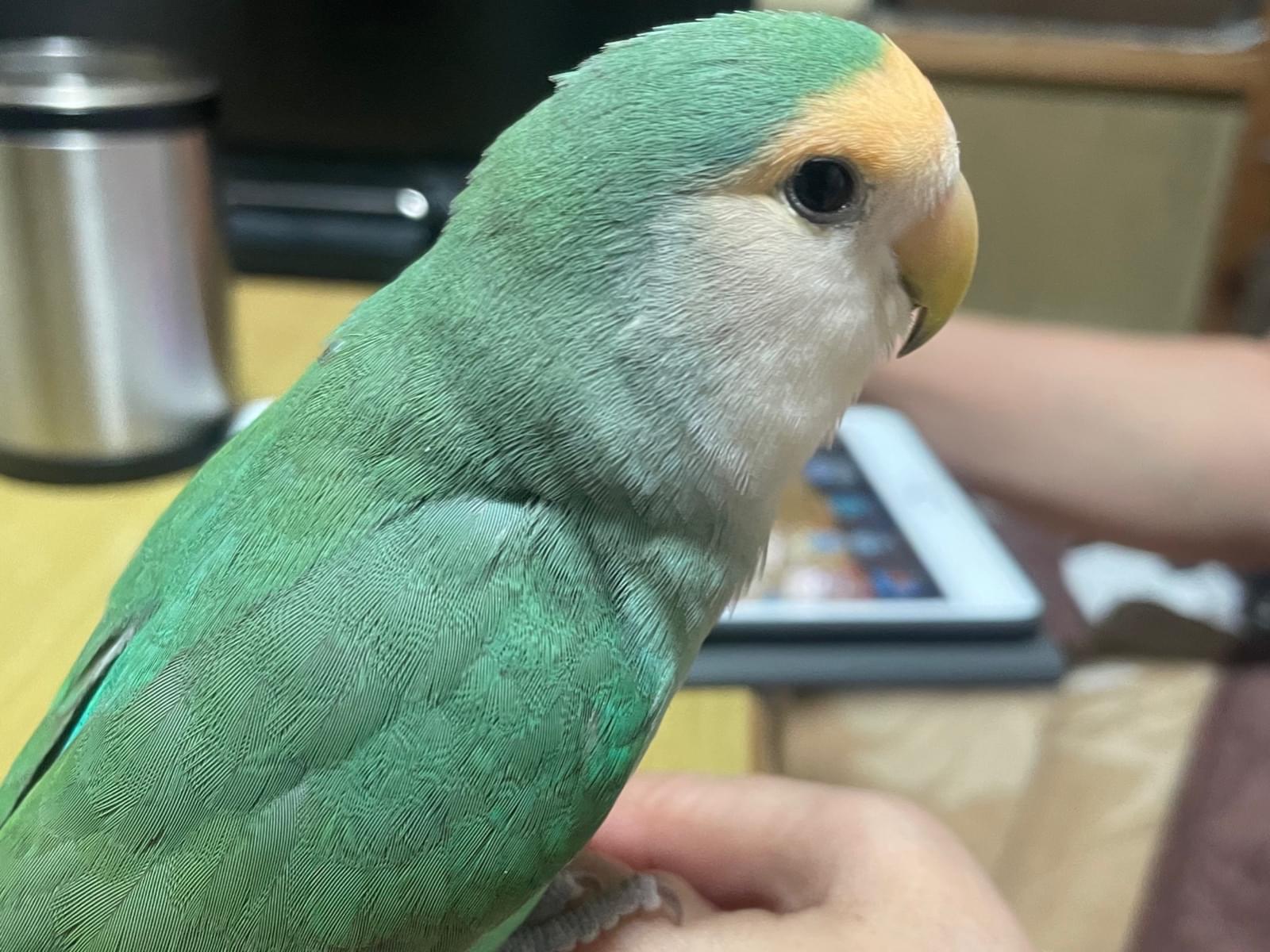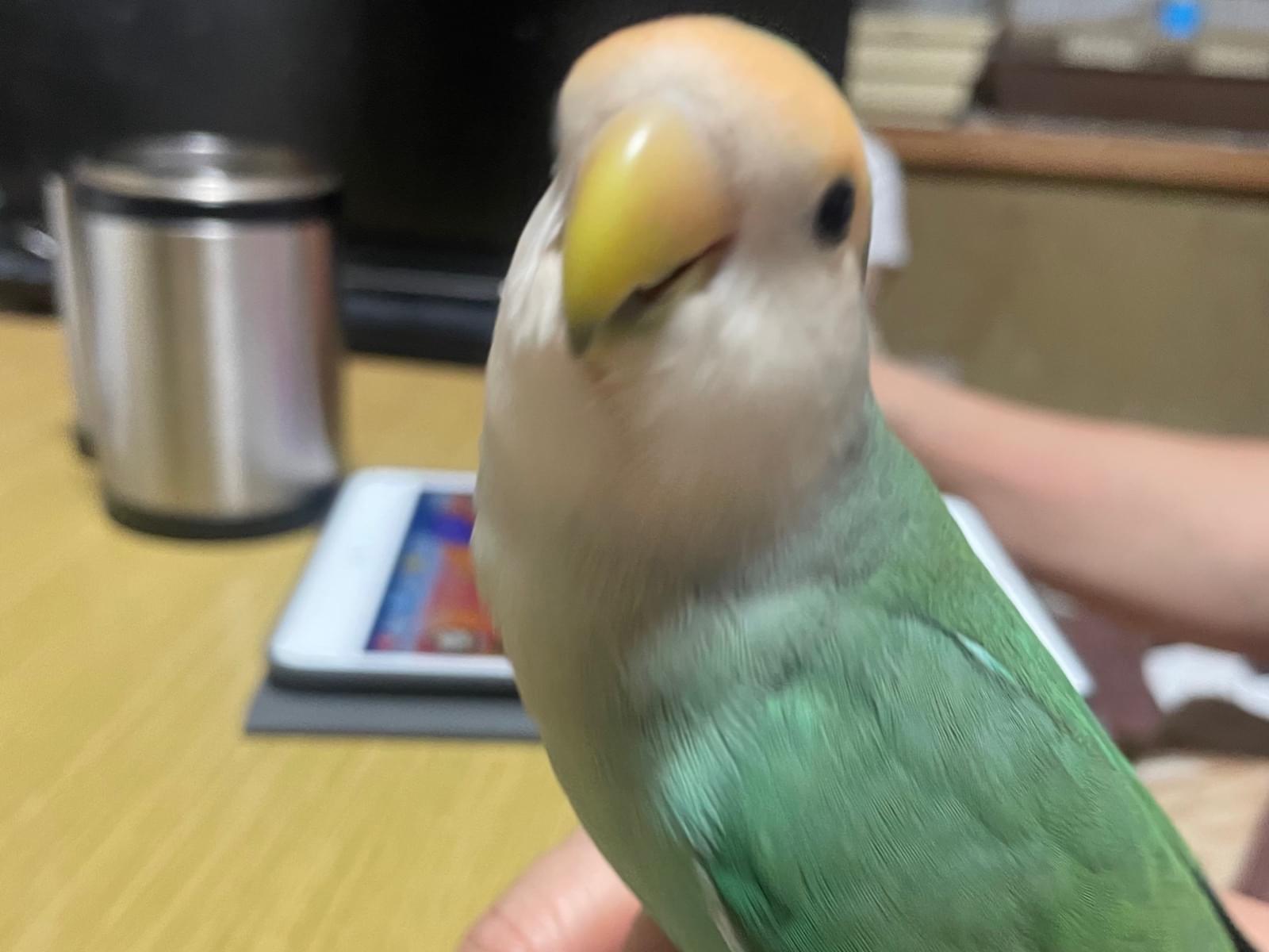 スマホ弄ってる手に乗りスマホを噛み噛みします。人の肩によく来ます。飛ぶのが大好き。