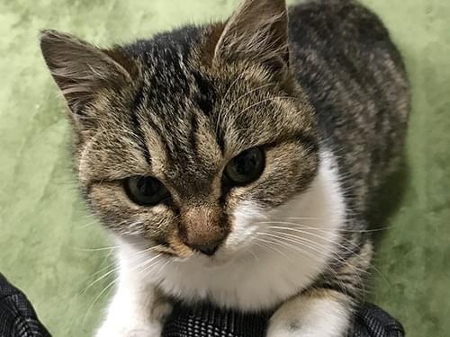 暗めの緑の瞳に、暗めキジトラと白のミックスの毛色、丸い顔をした可愛い子猫です。