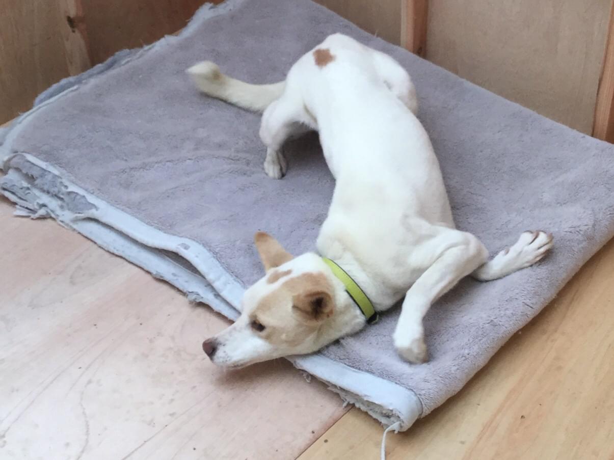 特徴…白茶、雌、10キロ、痩せ型、短毛、両耳がベージュ、右側の腹と尻にベージュの斑、おでこにハートの斑。