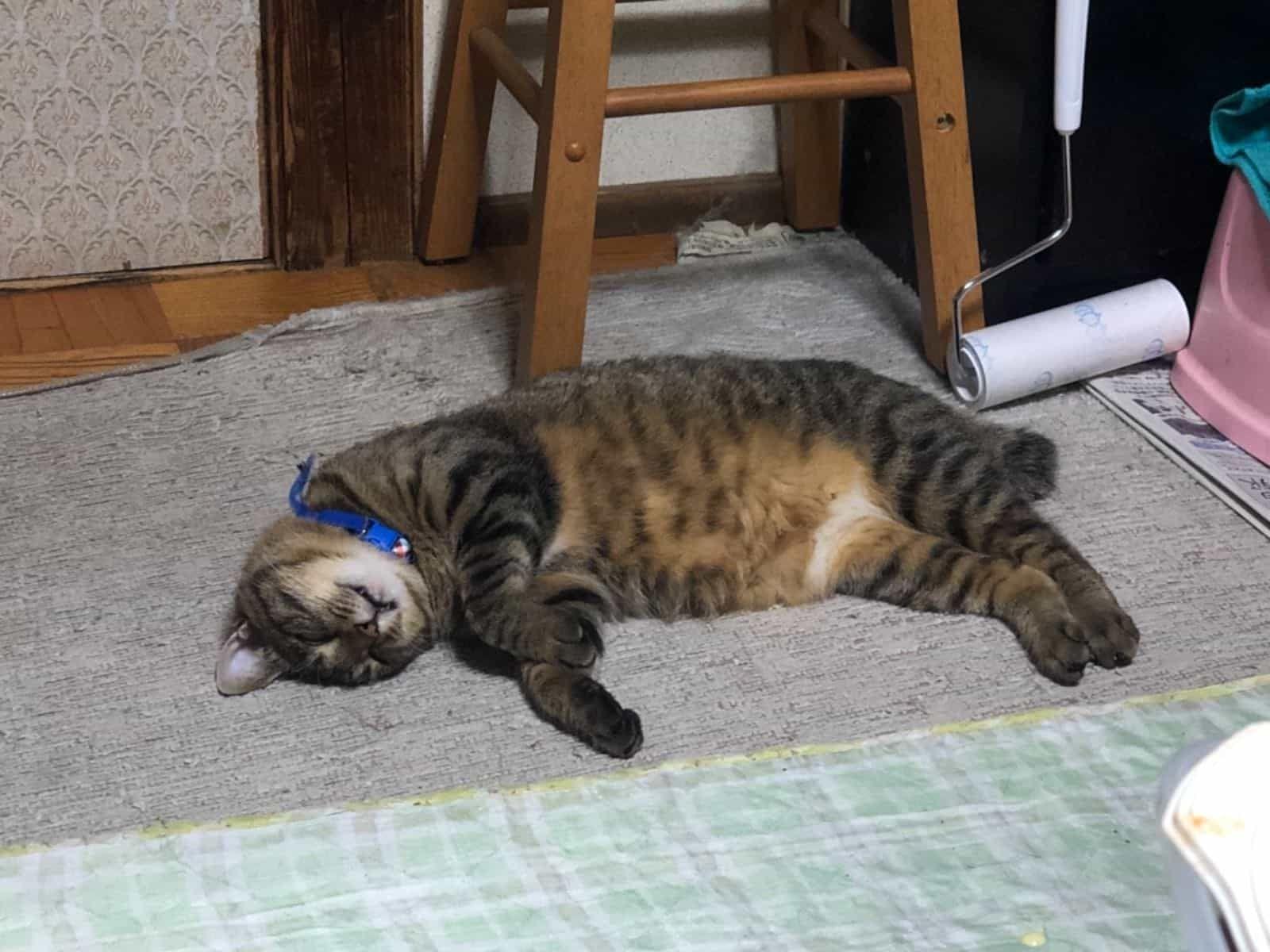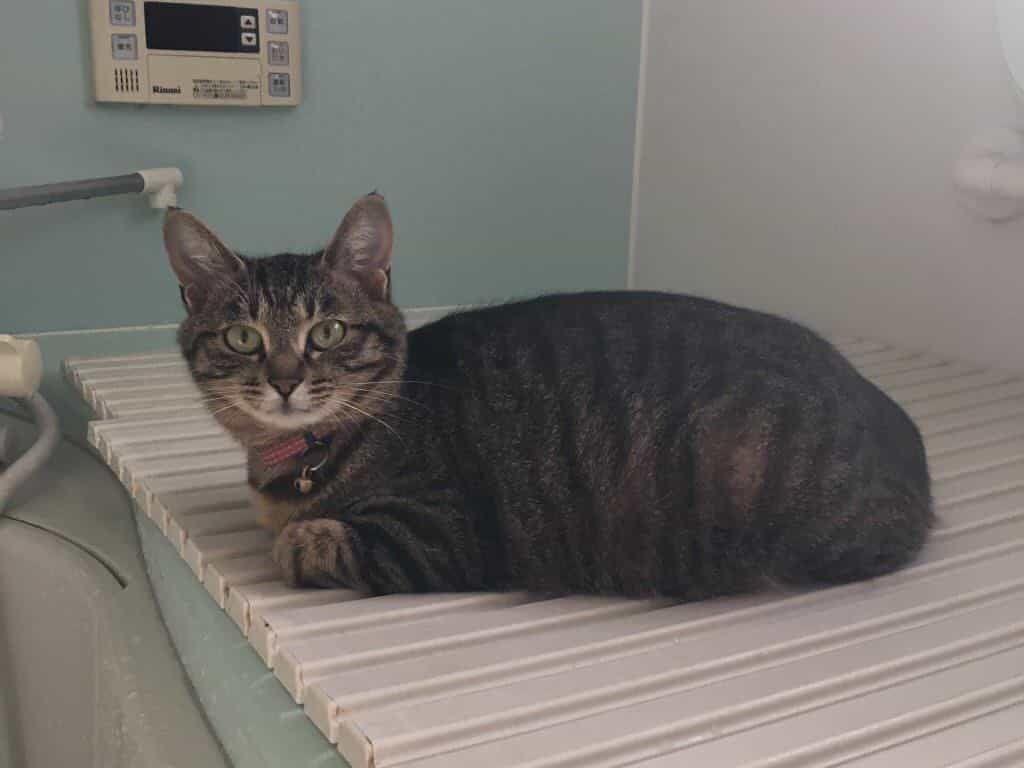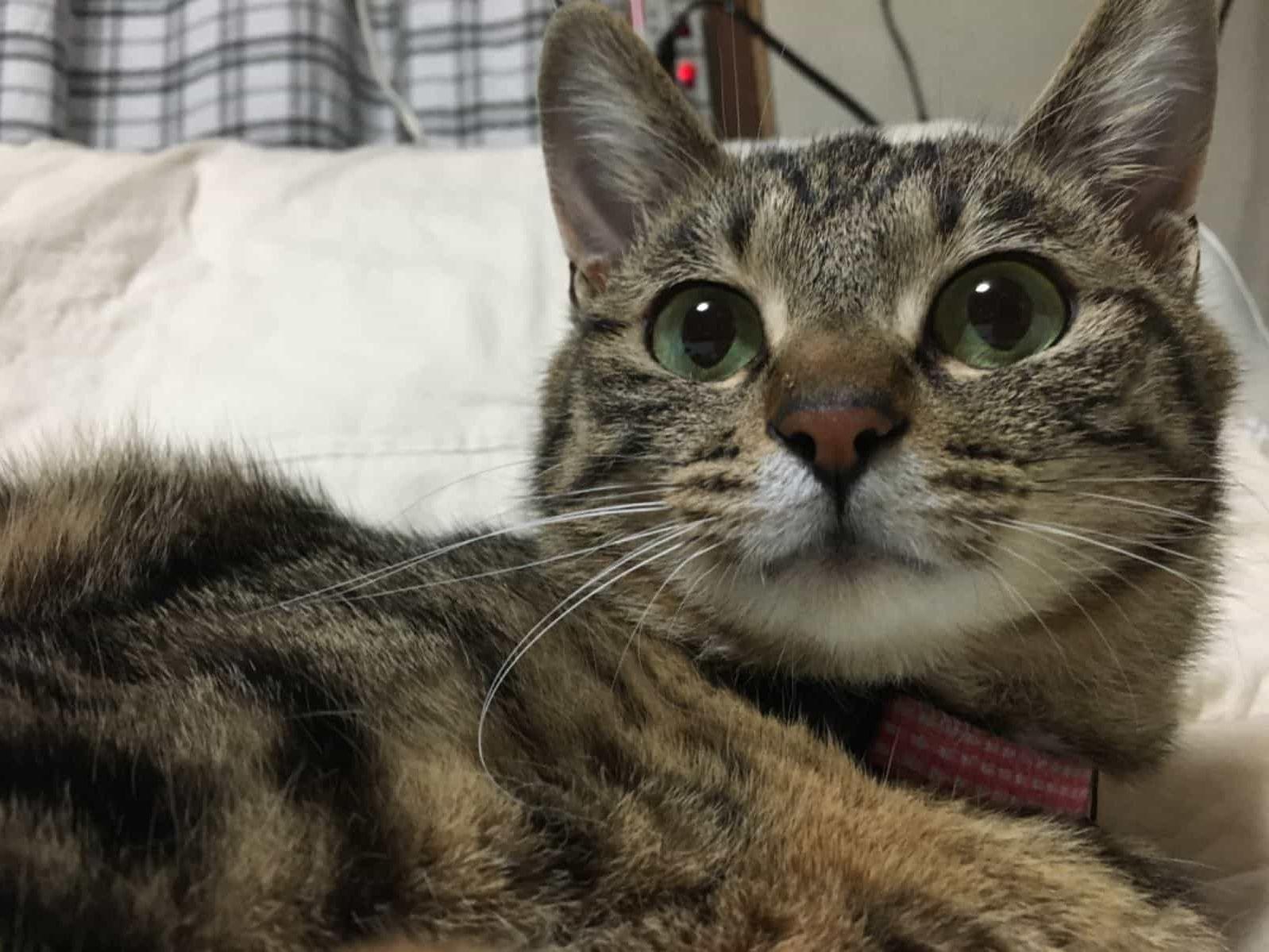 どこかで無くしてしまって付いていない可能性もありますが、白・赤・青チェックの首輪をしています。