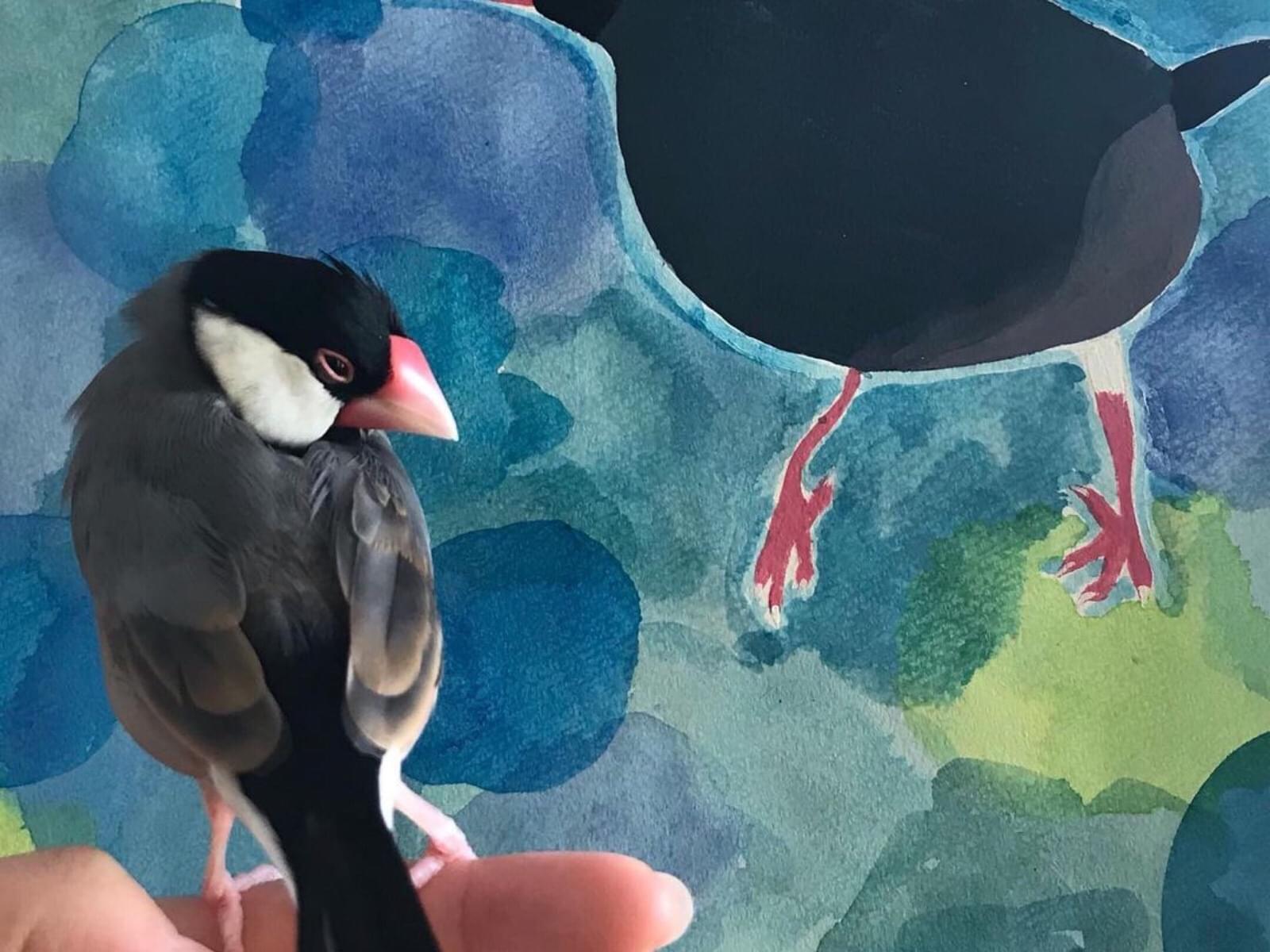 頭は真っ黒でグレーがかったグラデーション。くちばしと足はピンク色