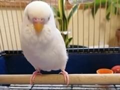 アルビビノ(白)で、人懐っこく、特に女性の肩に留まったりします。「ね~!」と首を斜めにしゃべります。