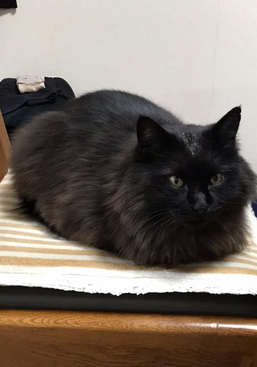紺色の首輪をしていて名前と携帯番号が入っています。