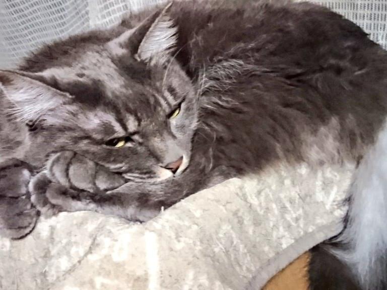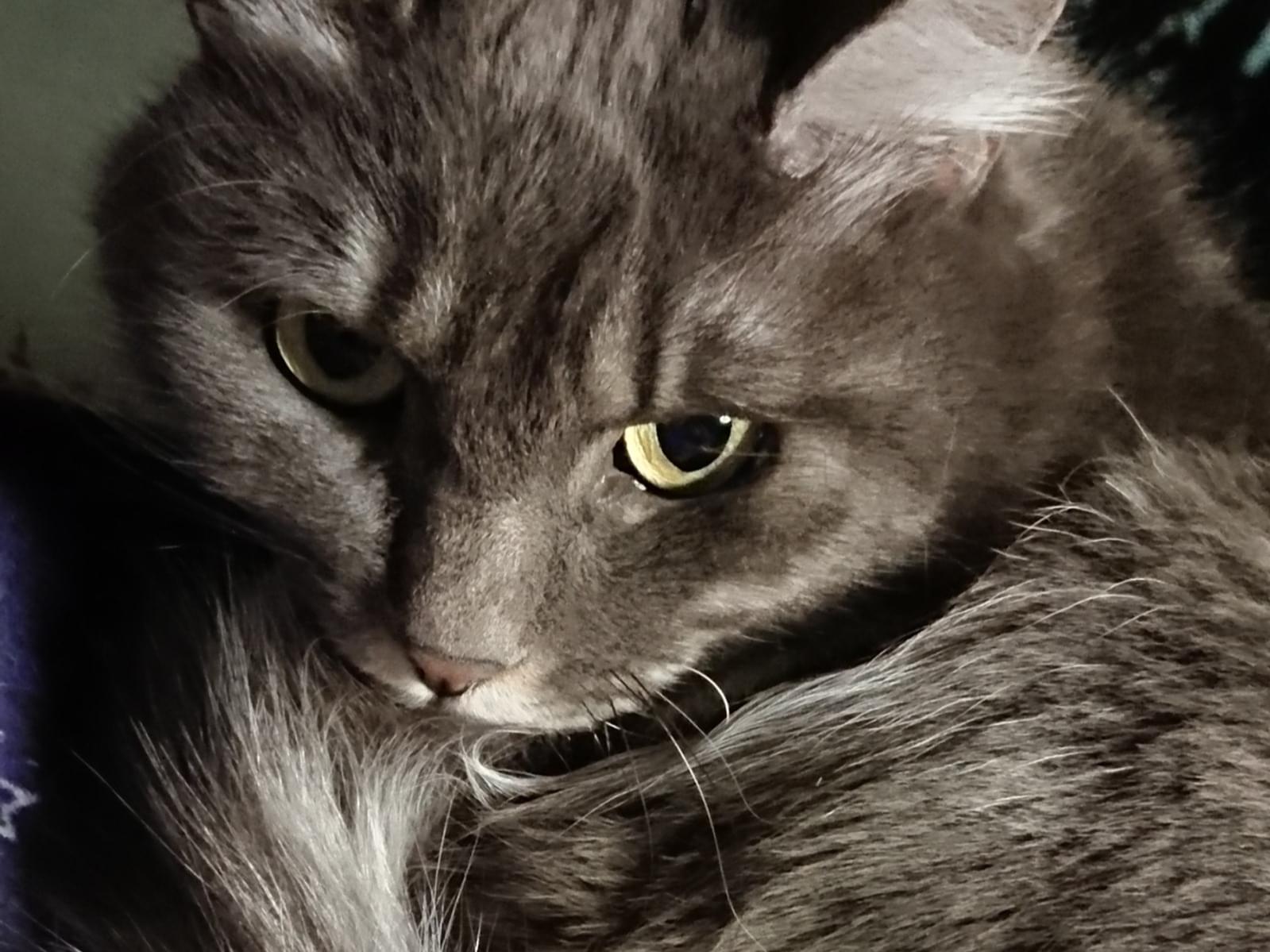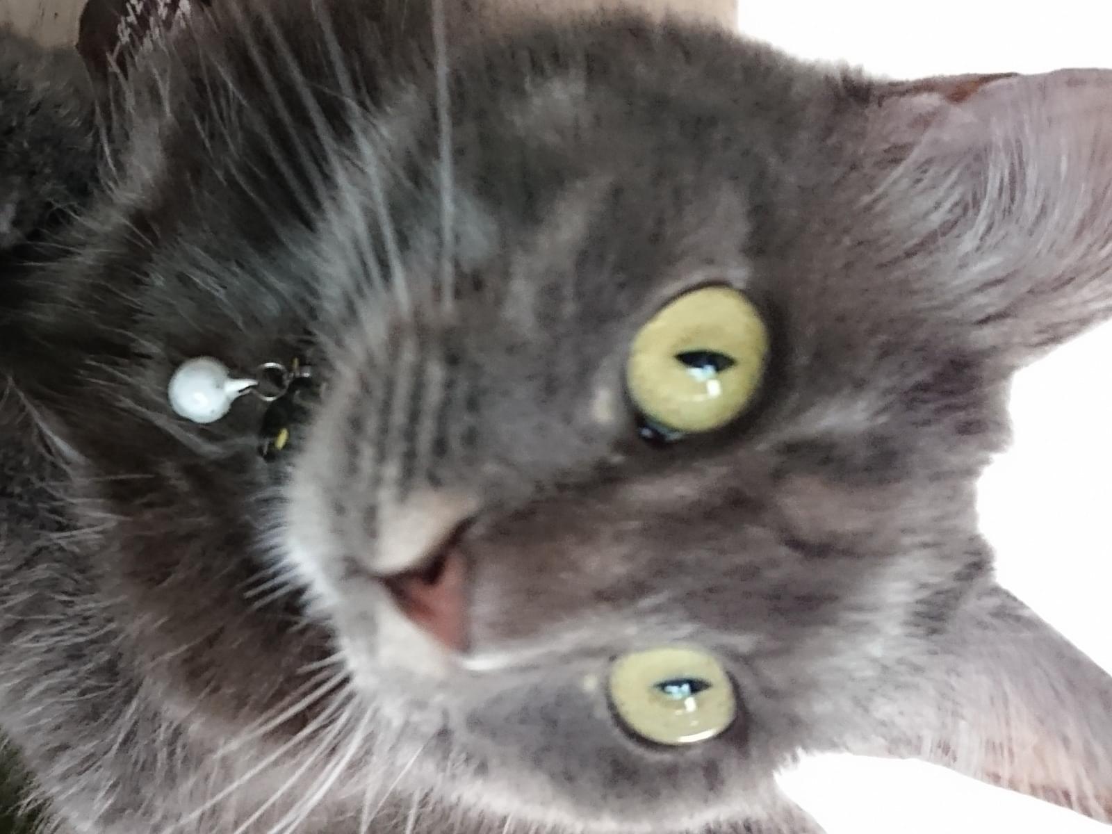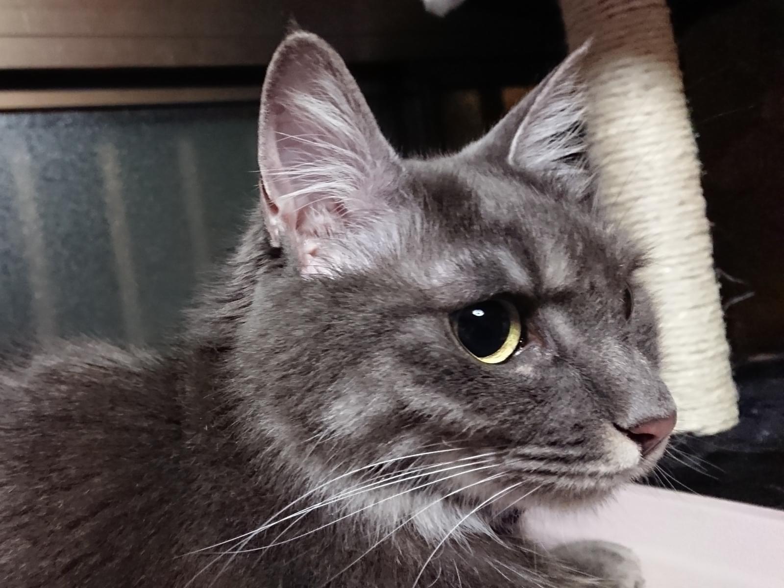 灰色の黄色目。長毛。毛で大きく見えますが小さいです。灰色っぽいですが光に当たると茶色っぽく見えたり影にはいると黒に見えたりもします。