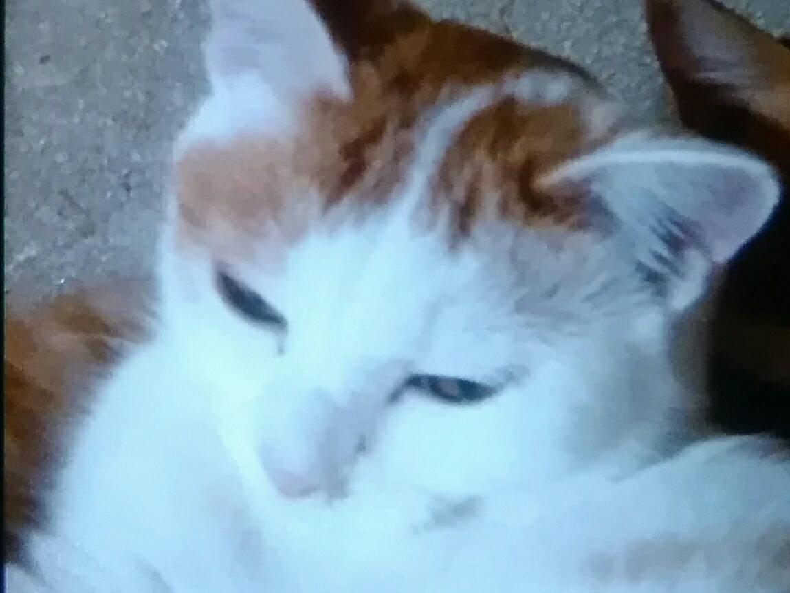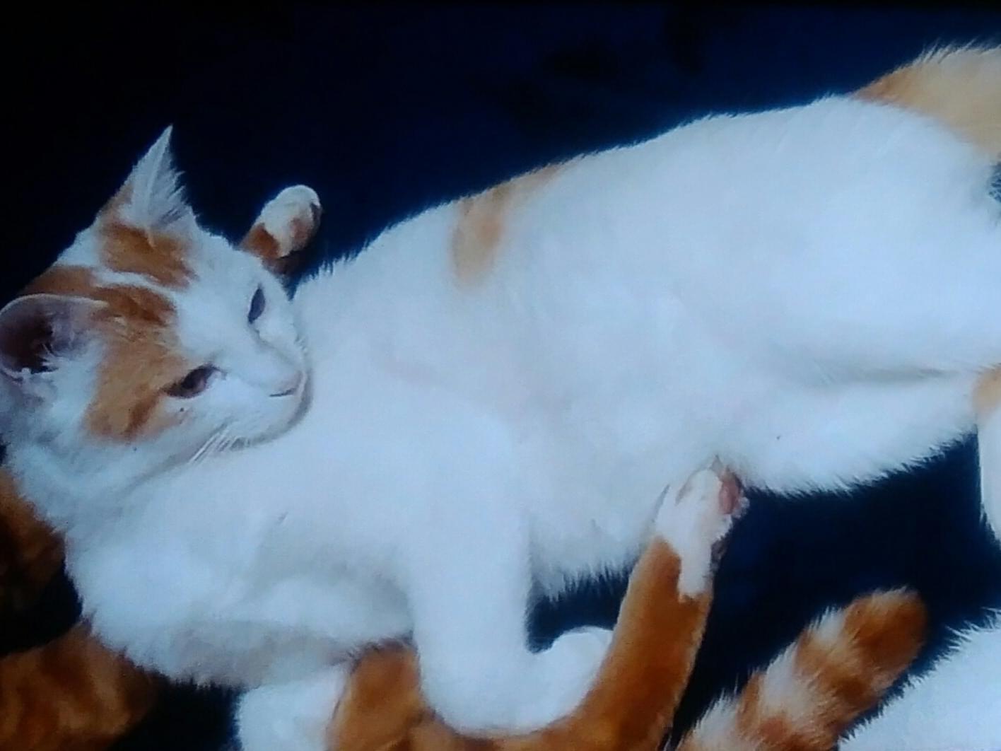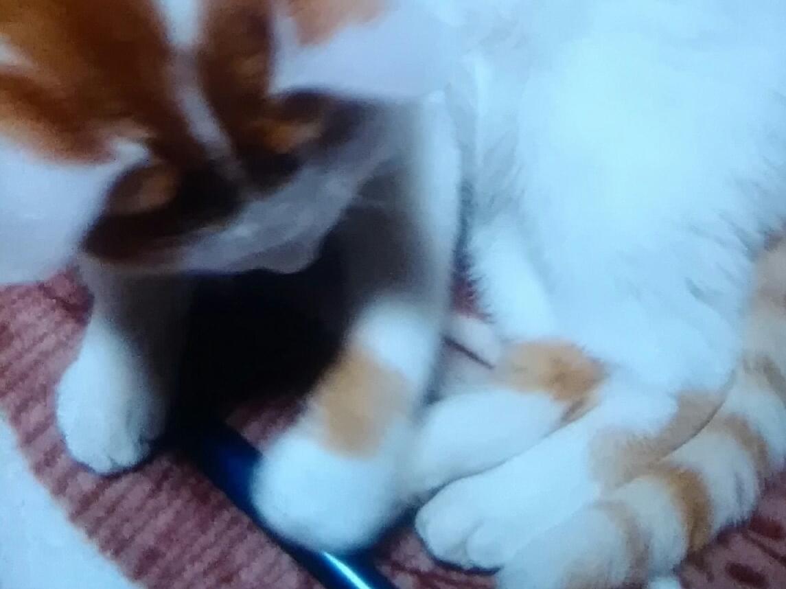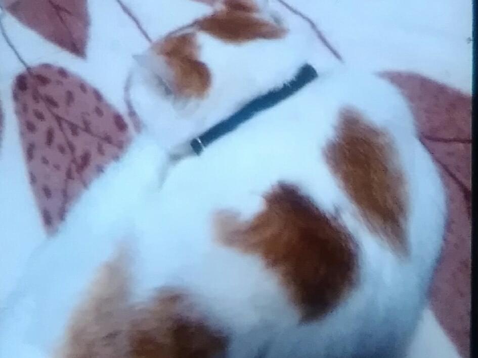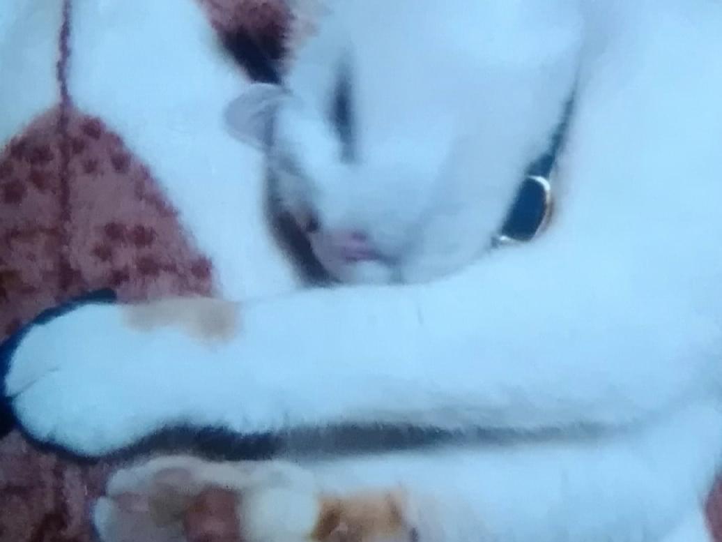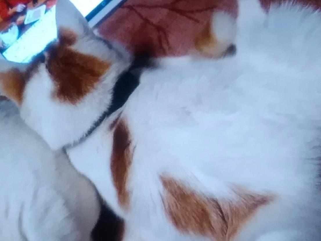 茶白で紺色の首輪をしています。首輪は衝撃に外れやすく、自分で外すこともあったので今は外れているかも知れません。
