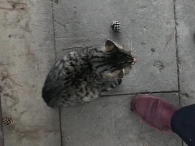 頭からお尻(尻尾を除く)までだいたい40cmくらい、尻尾はほぼ真っ直ぐのキジトラのオスです。首輪はしていませんでした。