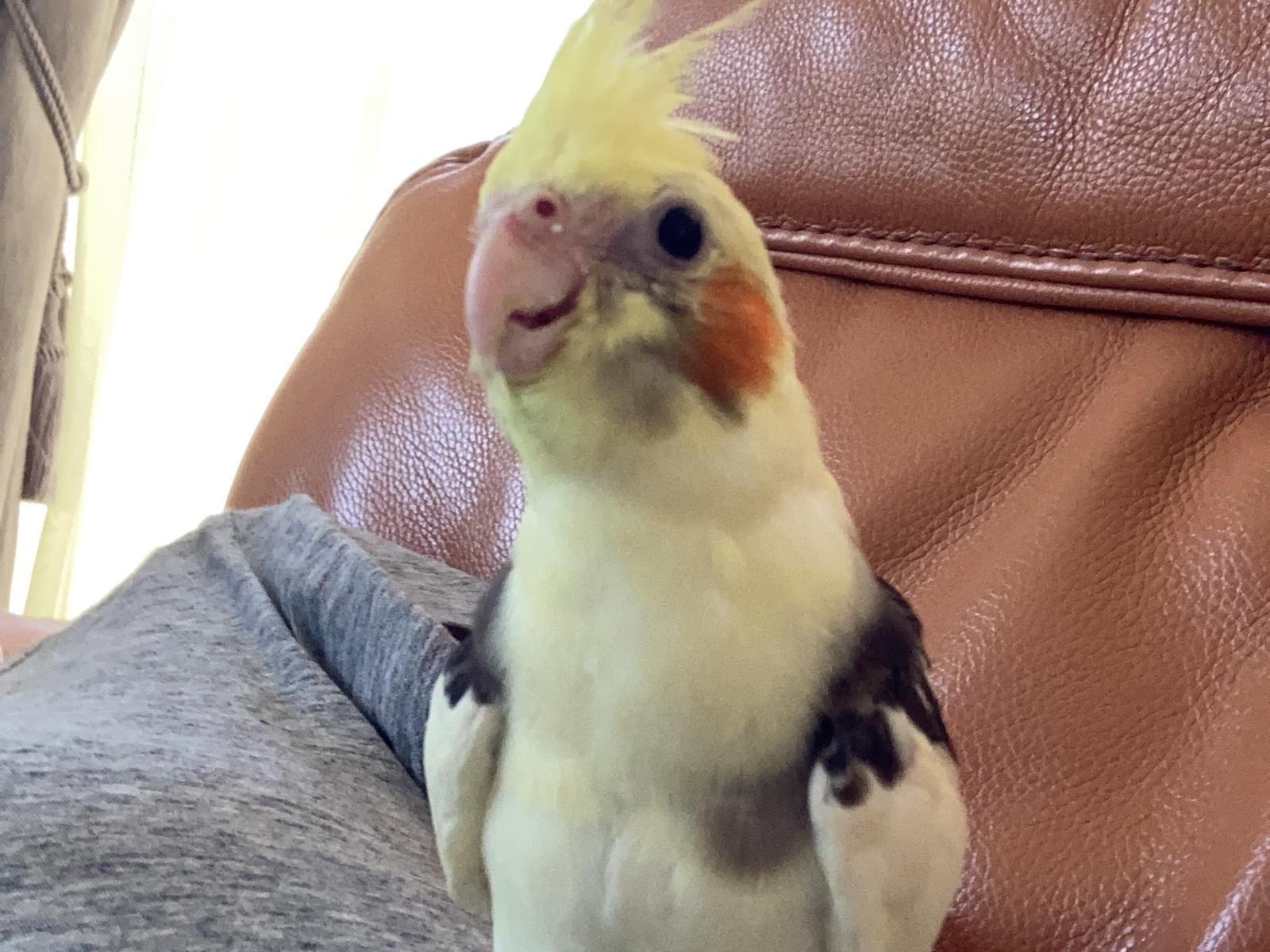 朝お兄ちゃんが学校に行く時、お見送りをしてるとドアから飛び立ちました。ドンという音でパニックになったようです。人見知りで怖がりです。人間の食べ物には興味があり、口をもぐもぐしてると口の中にくちばしを入れて欲しがります。言葉は話せません。ピッピやピーと言います。