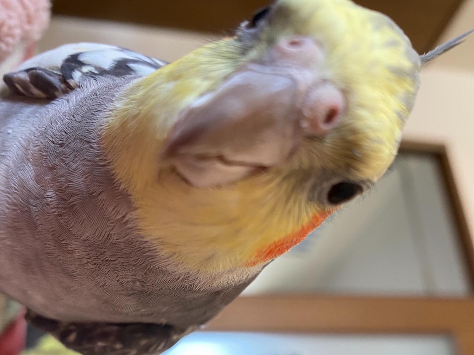 体グレー、顔黄色、ほっぺたオレンジ、尾っぽ黄色、
