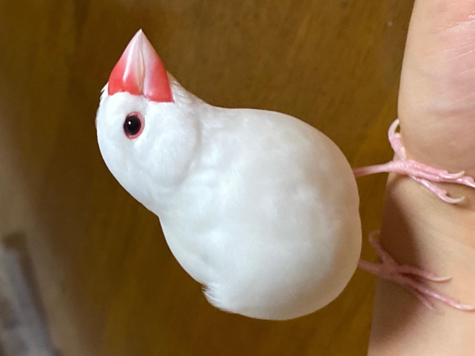 特徴は、全体的に真っ白な羽根ですが、腰のあたりをよく見ると、ほんの少しヒナの頃の灰色の羽根がうっすら混ざってる部分があります。