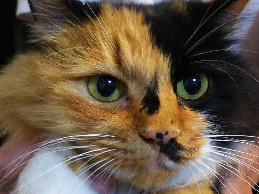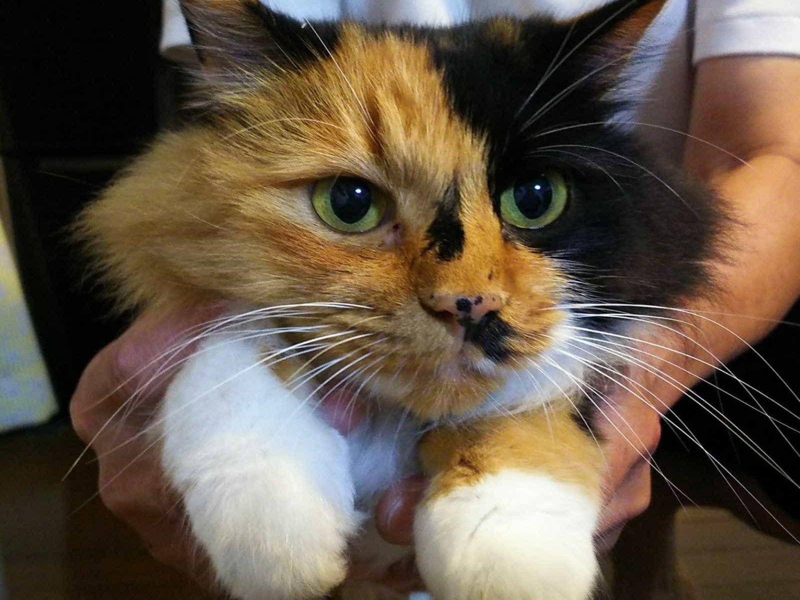 顔の半分が黒毛で、瞳がゴールドの三毛猫を探してます